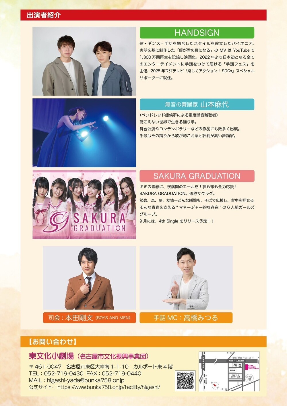 手話や字幕つきのパフォーマンスとMCで、耳が聴こえない(聴こえにくい)人も、そうでない人も一緒に楽しめる一日をお届けします。