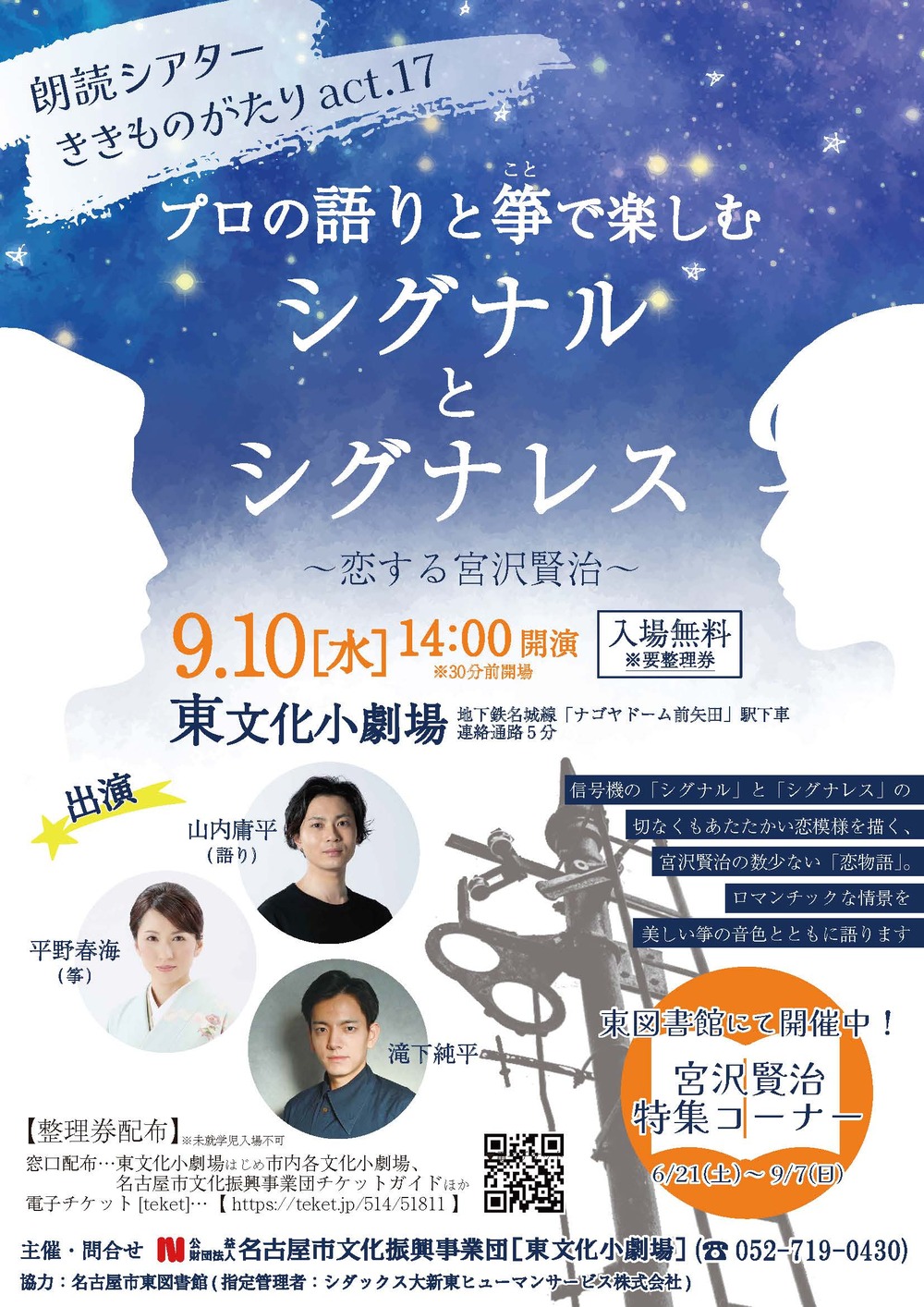 信号機の「シグナル」と「シグナレス」を取り巻く切なくも暖かみのある恋模様を、賢治特有のユーモアとロマンチックな描写で綴ったこの作品を美しい箏の音色とともにお届けします。