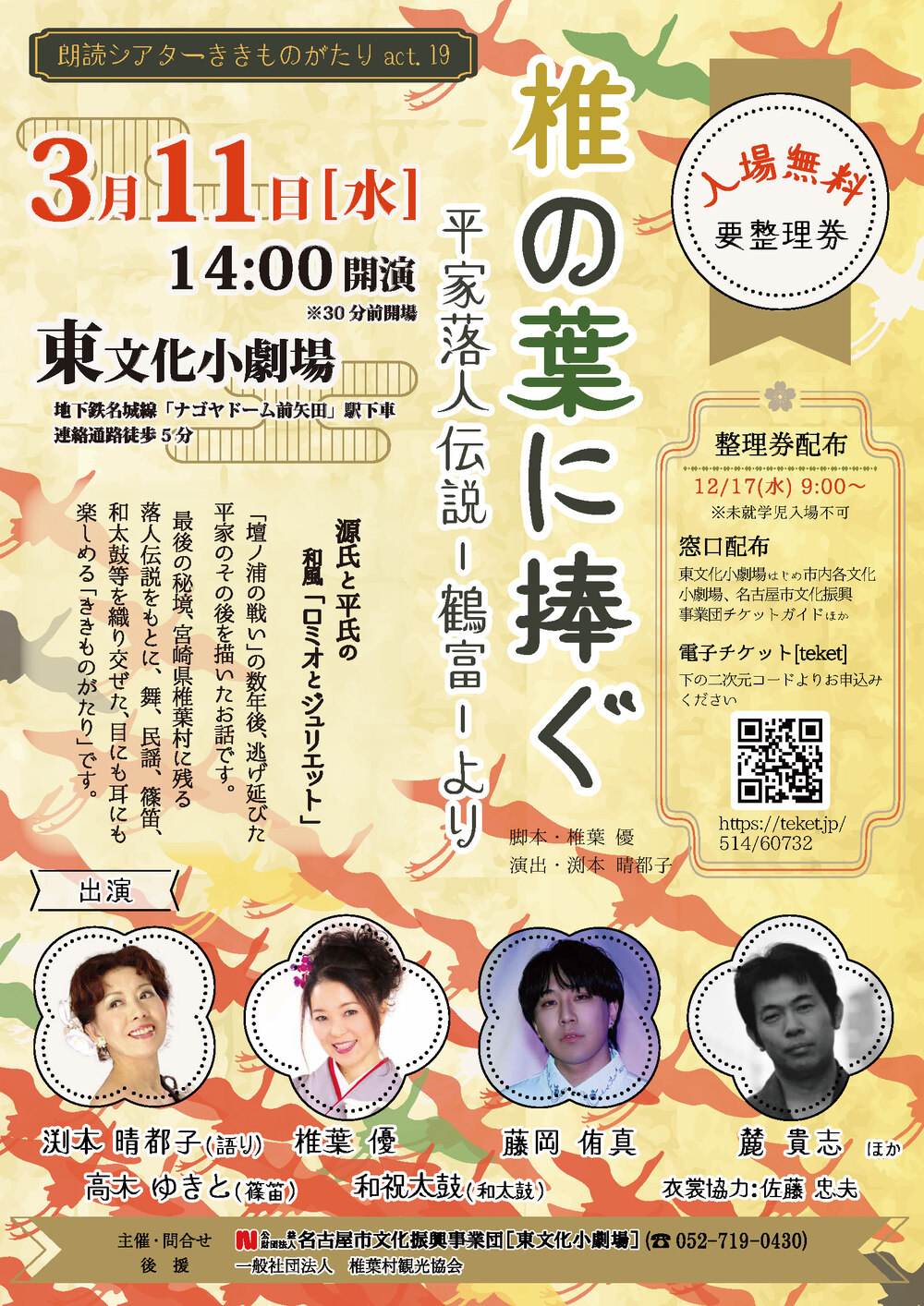 最後の秘境、宮崎県椎葉村に残る落人伝説をもとに、舞、民謡、篠笛、和太鼓等を織り交ぜた、目にも耳にも楽しめる「ききものがたり」です。
