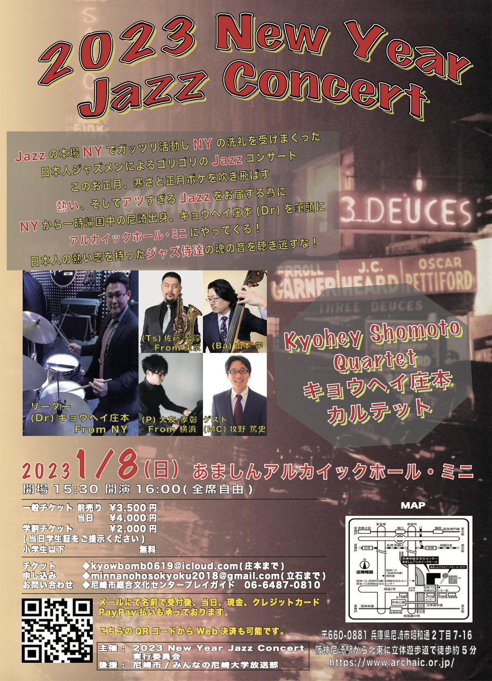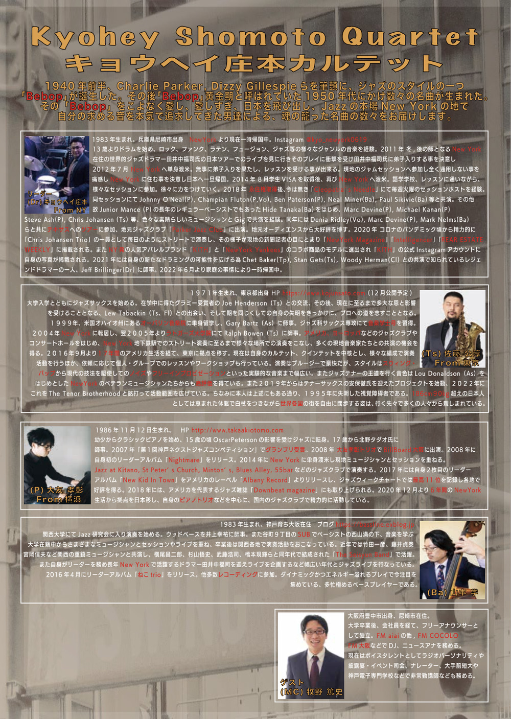 このお正月、寒さと正月ボケを吹き飛ばす熱い、そしてアツすぎるJazzをお届けする為にN.Y.から一時帰国中の尼崎出身、キョウヘイ庄本(Dr)を筆頭にキョウヘイ庄本カルテットがアルカイックホールにやってくる!