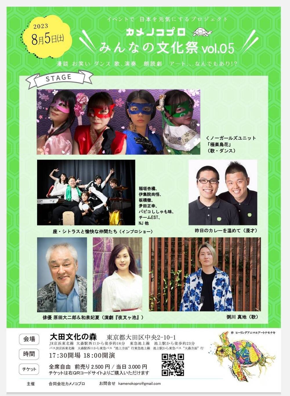 俳優 原田大二郎&和泉妃夏with原田虎太郎(朗読芝居『夜叉ヶ池』・トークショー)/くノ一ガールズユニット「極楽鳥花」(歌・ダンス)/昨日のカレーを温めて(漫才)/粥川真地(歌)/座・シトラスと愉快な仲間たち(稲垣杏橘、伊集院尚悟、板橋徹、夛田正幸、パピコししゃも味、チームEST、NJ 他(インプロショー)