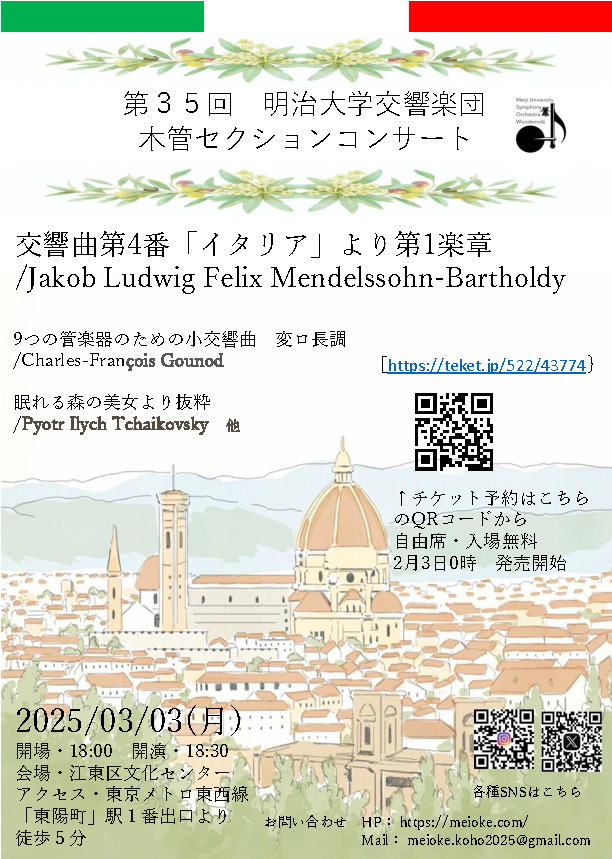 明治大学交響楽団は、大正12年(1923年)に新交響楽団(現NHK交響楽団)創設時のメンバーであった故尾原勝吉先生(当団永久指揮者)等の手によって創設されました…