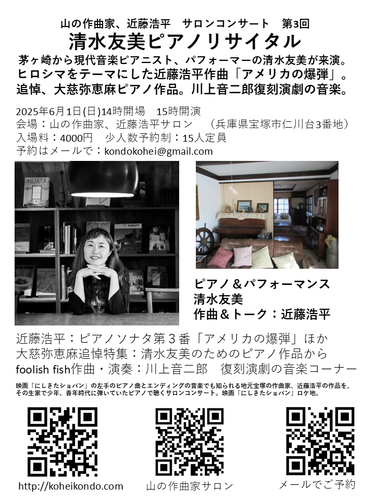 近藤浩平が核兵器、ヒロシマ、ナガサキをテーマに清水友美のために作曲した弾き語り付きのピアノソナタ、ピアノソナタ第3番「アメリカの爆弾」をはじめ