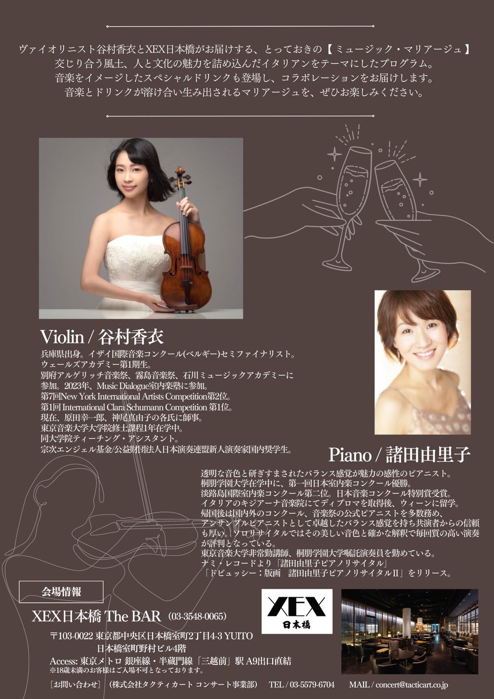 ヴァイオリニスト谷村香衣とXEX日本橋がお届けする、とっておきの【 ミュージック・マリアージュ 】
