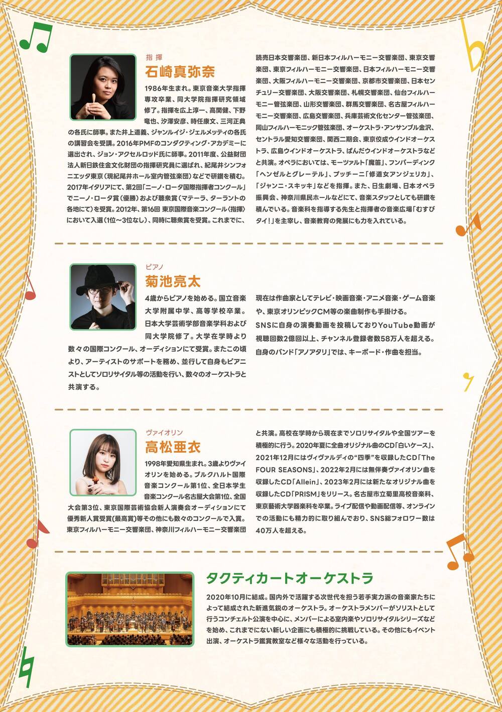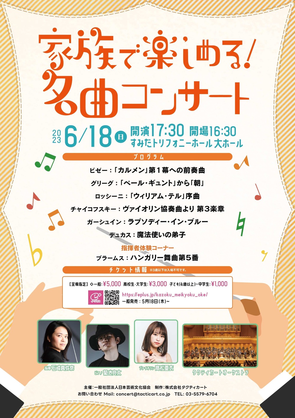 指揮には、国内外のコンクールでの優勝・入賞歴を持つ 石崎真弥奈氏を迎え、『魔法使いの弟子』や『ウィリアム・テル序曲』などをはじめとしたオーケストラの超名曲を、MCも交えつつ、タクティカートオーケストラの若さ溢れる演奏でたっぷりお届けいたします。