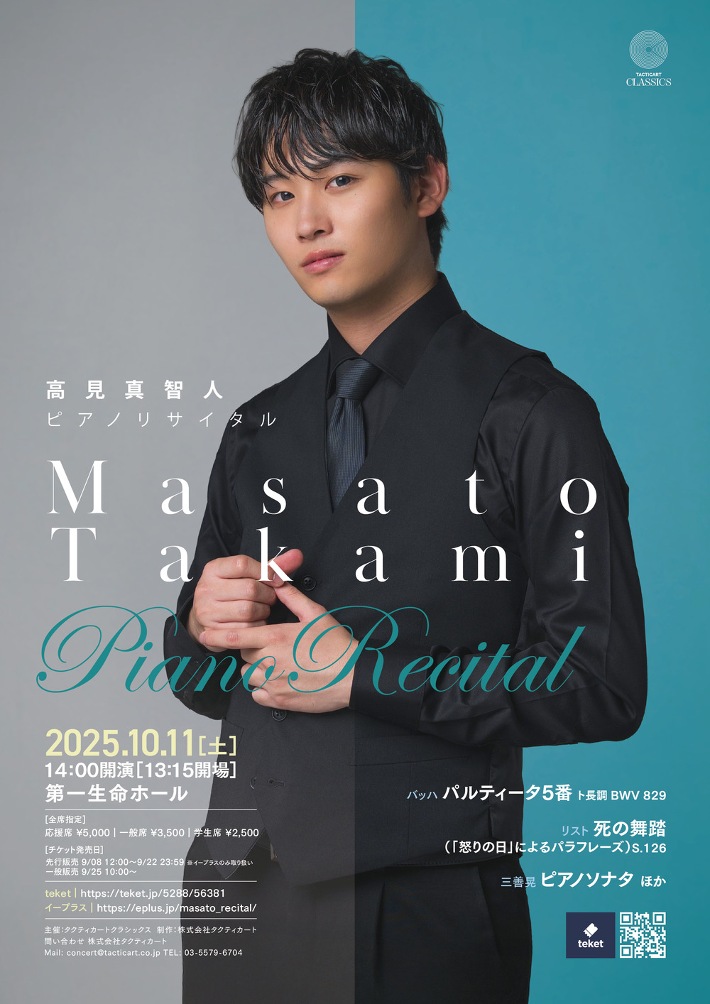2025年10月11日(土)に第一生命ホールにてピティナ特級ファイナリスト、東京音楽コンクールなどで注目を集める若手ピアニスト・高見真智人ピアノリサイタルの開催が決定しました!