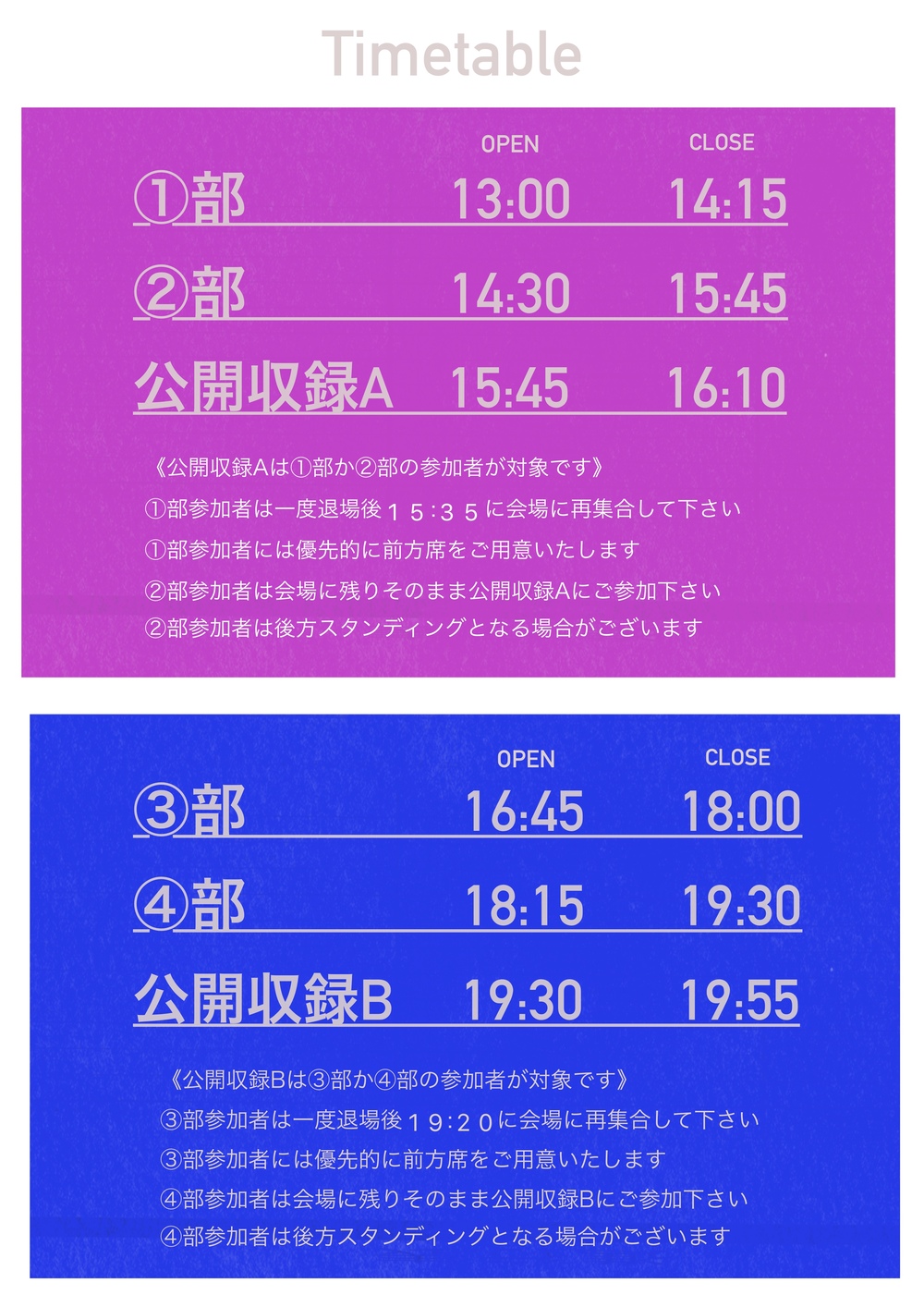 ③部④部どちらもご参加のお客様は④部終了後そのまま会場にお残りいただき公開収録Bにご参加下さい、前方の観覧席を優先してご用意いたします。
