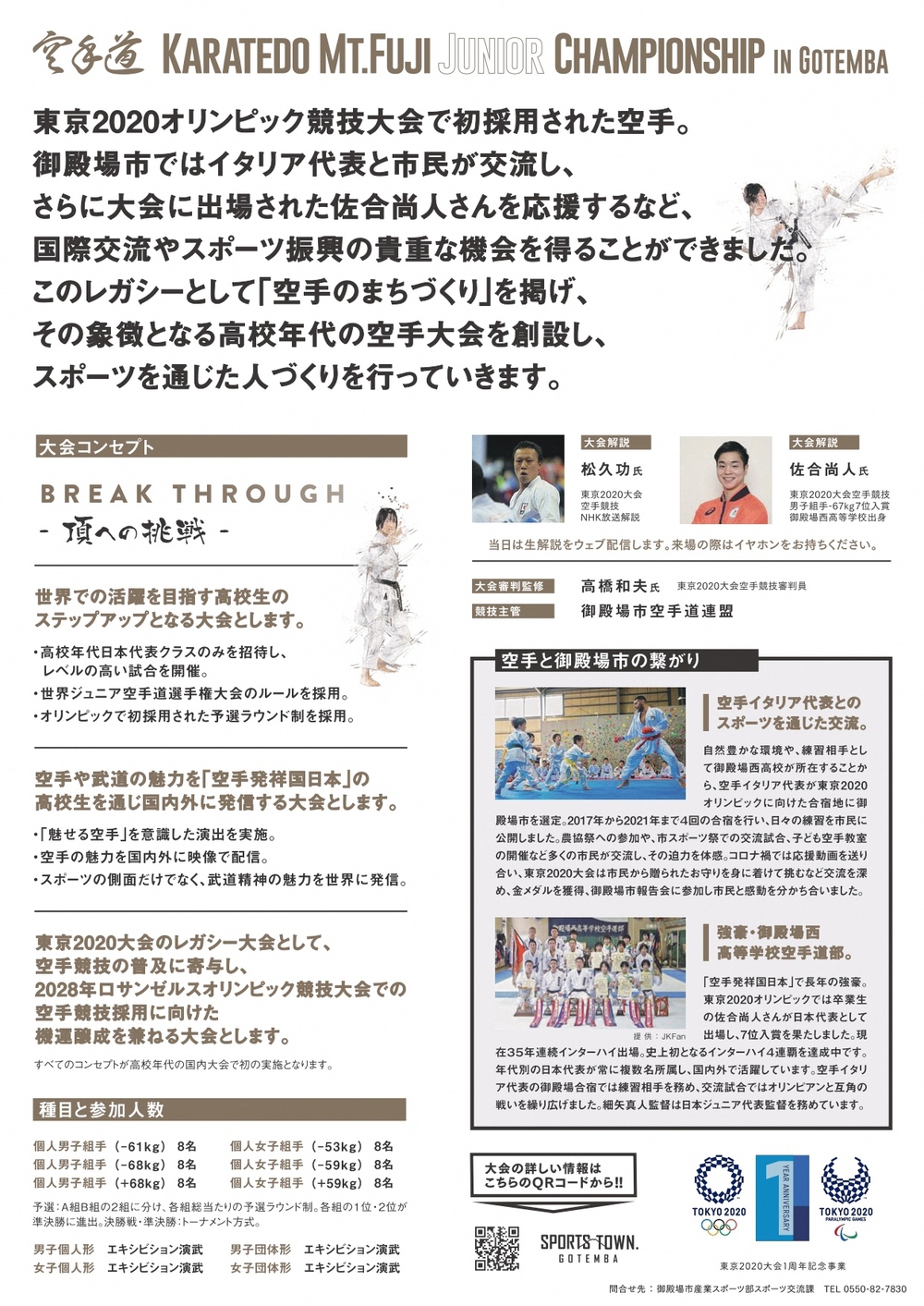 御殿場西高校卒業生で東京2020大会に出場した佐合尚人選手と同大会でテレビ解説を務めた松久功さんによる生解説(※)や、会場MC・大型ビジョンなど魅せる空手を意識した演出などが予定されています。