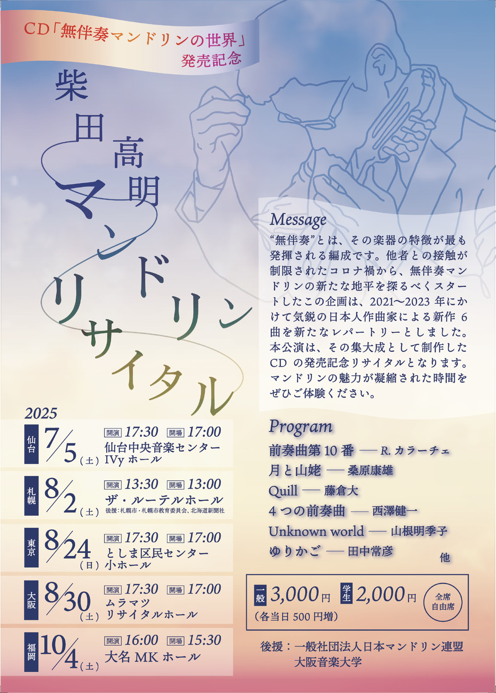 “無伴奏”とは、その楽器の特徴が最も発揮される編成です。他者との接触が制限されたコロナ禍から、無伴奏マンドリンの新たな地平を探るべくスタートしたこの企画は、2021〜2023年にかけて気鋭の日本人作曲家による新作6曲を新たなレパートリーとしました。本公演は、その集大成として制作したCDの発売記念リサイタルとなります。