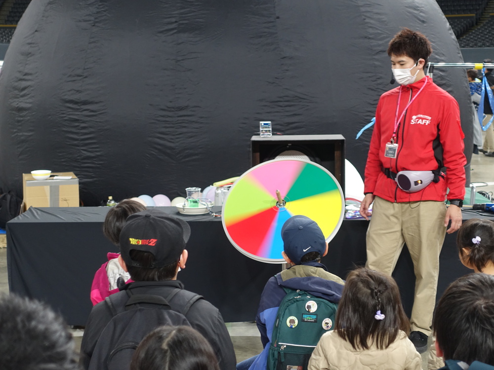 サイエンスショー/1、2回目「動いて?回って?不思議な世界」…サイエンスショー!ぐるぐる回ってあら不思議!君の予想は当たるかな?? 3、4回目「空気ってすごい」…7月~9月のちえりあで実施したサイエンスショー!空気の性質を巨大な装置を使って確かめます!