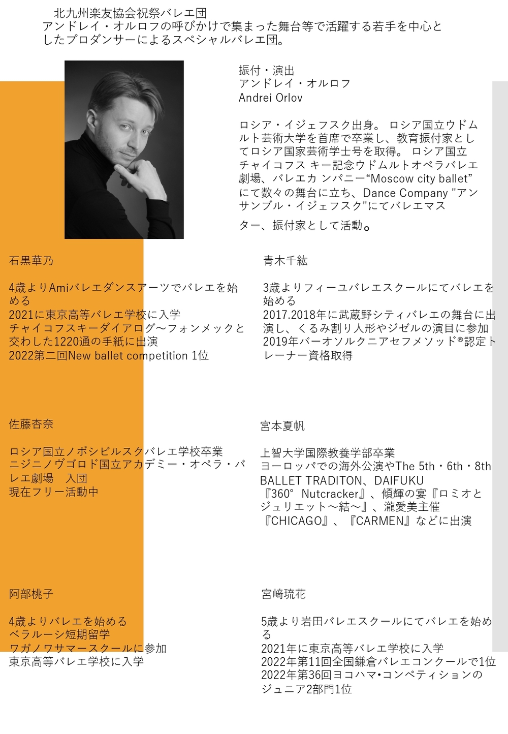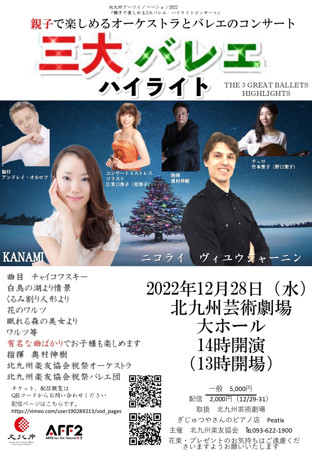 2022年12月28日(水)14時から北九州芸術劇場大ホールで北九州楽友協会主催オーケストラとバレエのコンサート「親子で楽しめる三大バレエ・ハイライトコンサート」を行います。プリンシパルに元米国コロンビア・バレエ団、各種メディアで大活躍のKANAMIさん、元ロシア国立ペルミオペラバレエ劇場・Kバレエカンパニーソリストのニコライ・ヴィユウジャーニンさんをお招きします。未就学児からお入り頂けます!2階席を親子シートとして開放しておりますので冬休みにご家族でぜひお越しくださいませ。