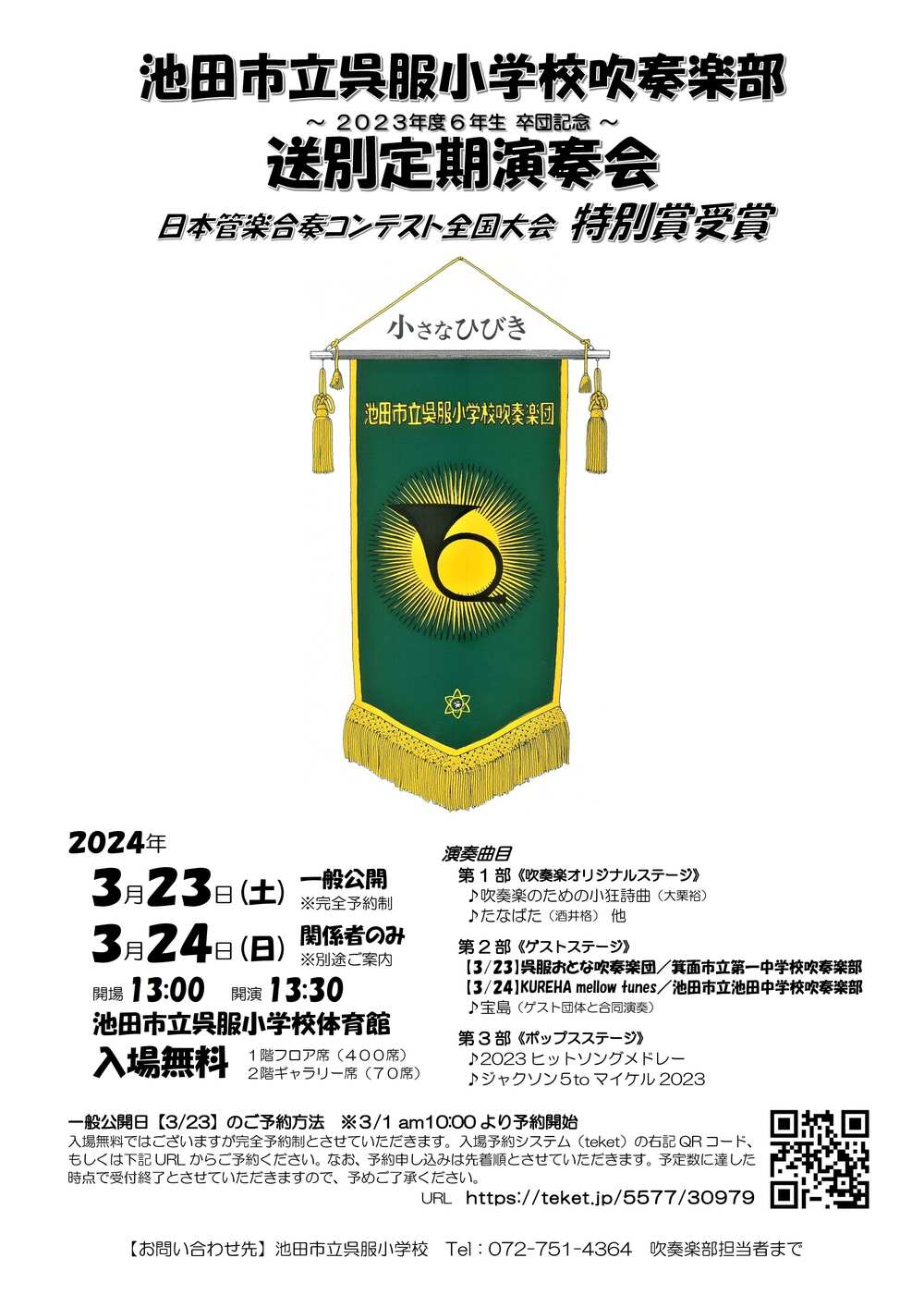 池田市立呉服小学校吹奏楽部は1948年(昭和23年)2月、元関西吹奏楽連盟理事長の故松平正守先生によって創部されました。