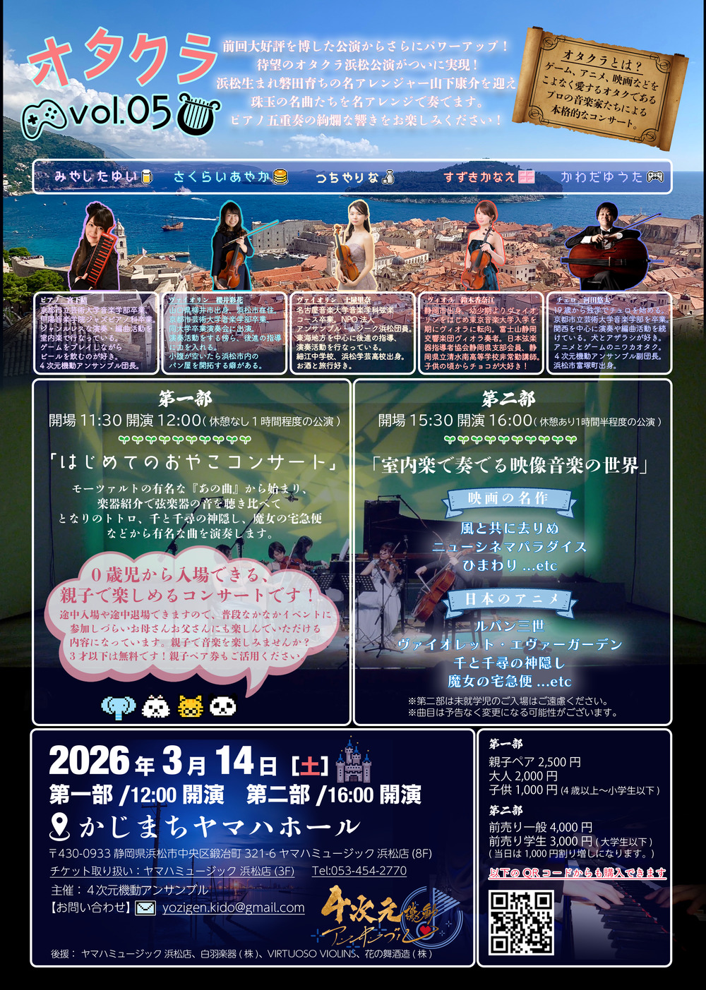 第2部は、ピアノ五重奏を中心とした映画やアニメ、ゲーム音楽の本格的なコンサート♪