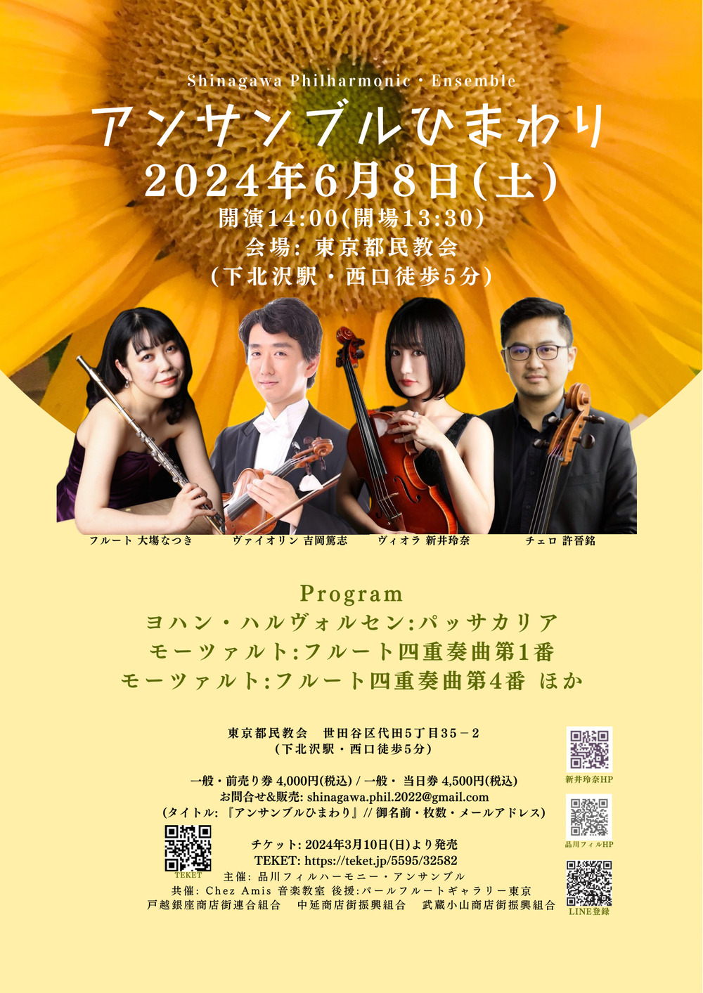 フルートカルテット中心に、フルート、ヴァイオリン、ヴィオラ、チェロによる小編成室内楽の楽しみ