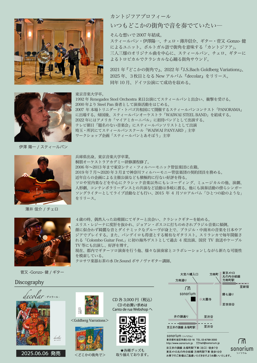三人三様のオリジナル曲を中心に、スティールパン、チェロ、ギターによるトロピカルでクラシカルな心踊る街角サウンド。