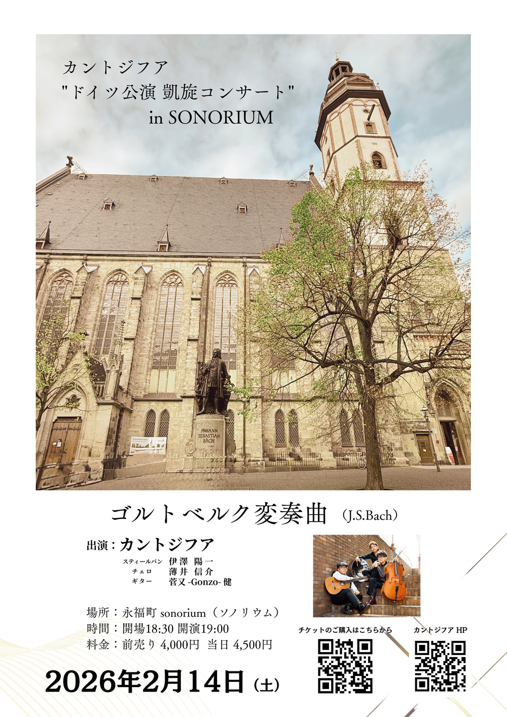 現地の方々の多大なる協力もあり、本場ドイツでの演奏は無事成功を収め、ドイツで感じてきたことや音の響きの良さを伝えたいという想いから、2026年2月14日(土)に永福町sonoriumにてカントジフア "ドイツ公演 凱旋コンサート" in SONORIUMを開催する運びとなりました。