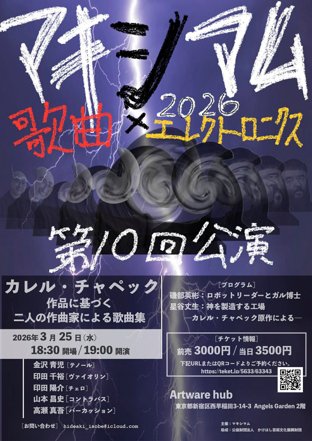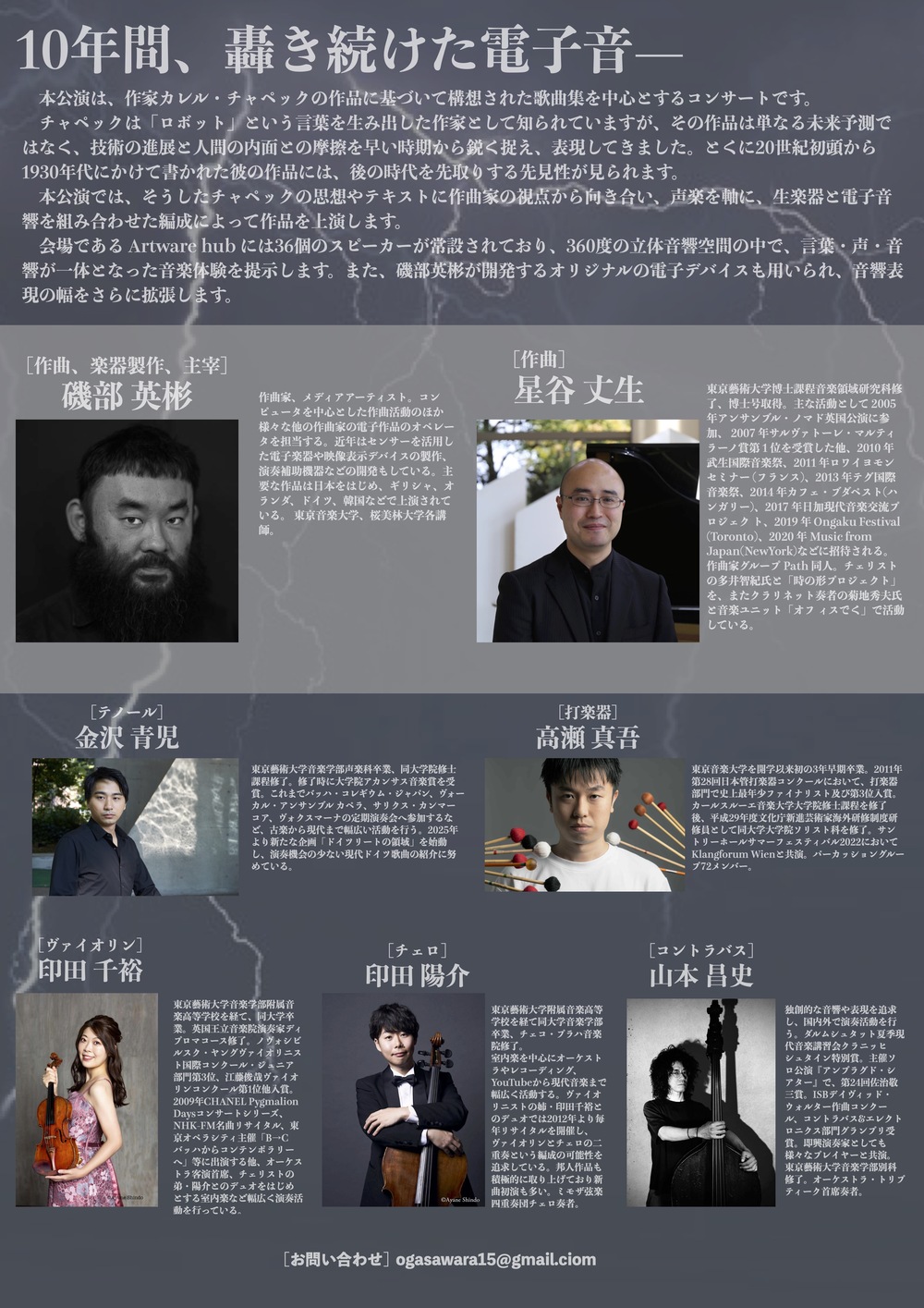 本公演では、そうしたチャペックの思想やテキストに作曲家の視点から向き合い、声楽を軸に、生楽器と電子音響を組み合わせた編成によって作品を上演します。