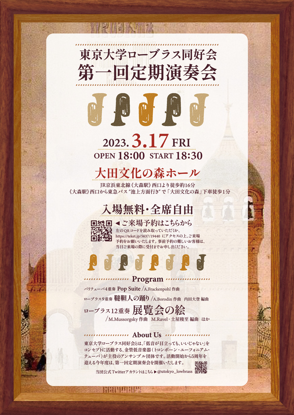 東京大学ローブラス同好会とは、「低音が目立っても、いいじゃない」をコンセプトに活動する、金管低音楽器(トロンボーン・ユーフォニアム・テューバ)が主役のアンサンブル団体です。今年度で活動開始から6周年を迎え、第二回定期演奏会を開催いたします。