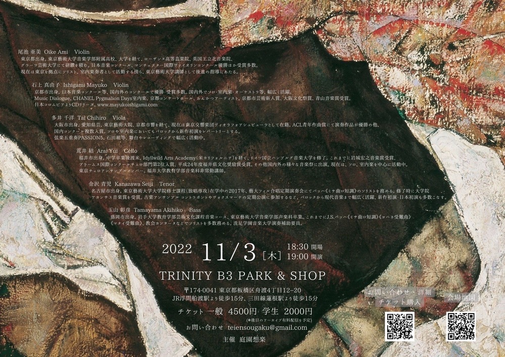 庭園想楽、弦楽五重奏PASSION5、石田組等、舞台やレコーディングで幅広く活動中。