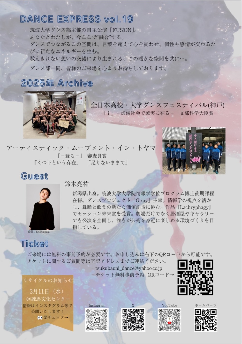 本公演では、第37回全日本高校・大学ダンスフェスティバル(神戸)にて文部科学大臣賞を受賞した『「i」―虚像社会で誠実にある―』、アーティスティック・ムーブメント・イン・トヤマ2025にて審査員賞を受賞した『―蘇る―』に加え、『くつ下という存在』および『足りないままで』を上演いたします。