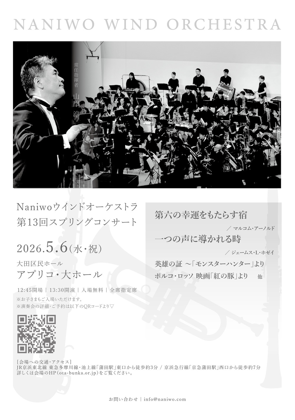 Naniwoウインドオーケストラは、2008年に企画演奏会としてはじまり、2011年に山岸淳を常任指揮者に迎え入れ、アマチュアの常設吹奏楽団として新たにスタートを切りました。年2回の演奏会に加えて、夏にはアンサンブルコンサートを開催するなど、精力的に活動を続けています。パワフルで彩り豊かなNaniwoらしい演奏を追及しながら、皆さまに感動と音楽の楽しさをお伝えできる楽団へと成長するべく、日々精進しております。