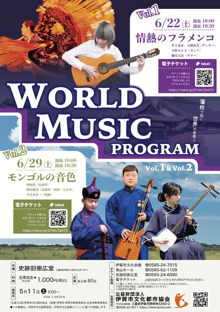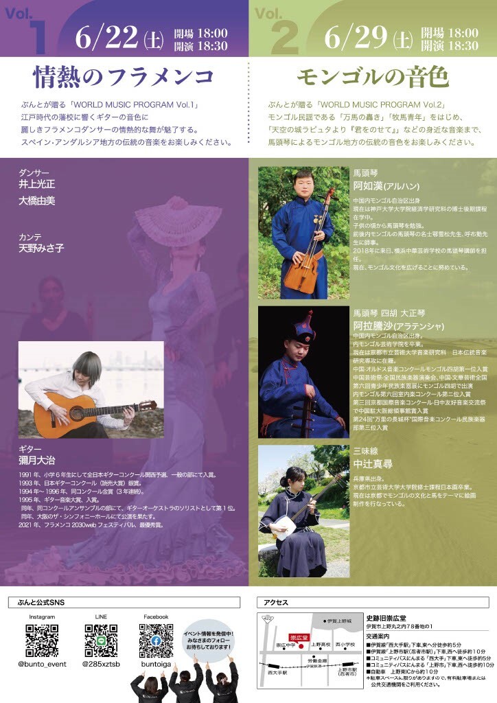 モンゴル民謡である「万馬の轟き」「牧馬青年」をはじめ、「天空の城ラピュタより『君をのせて』」などの身近な音楽まで馬頭琴によるモンゴル地方の伝統の音色をお楽しみください。