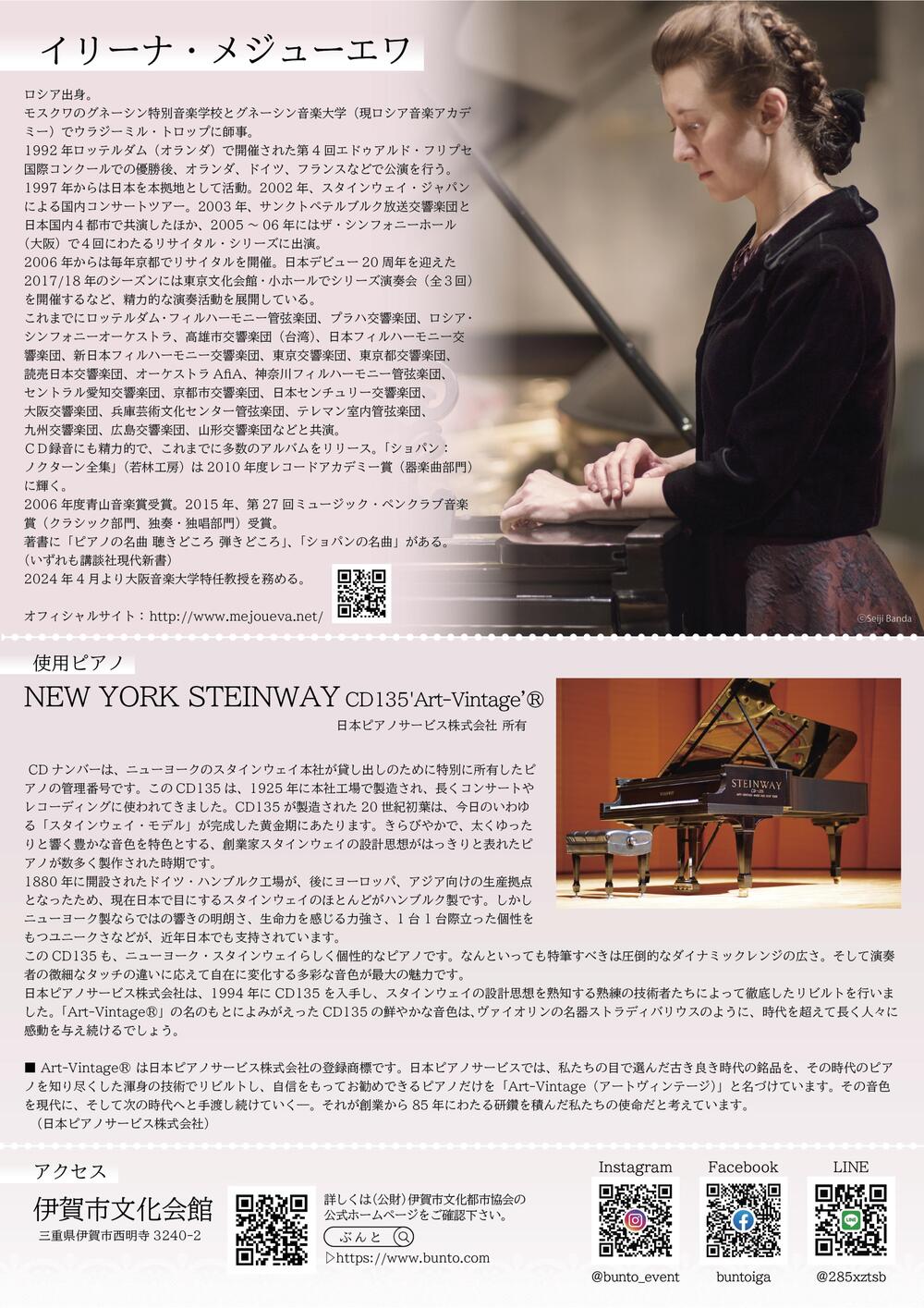 舞台の同じ位置に各ピアノを設置し、世界的ピアニスト イリーナ・メジューエワが同じ曲を演奏します。