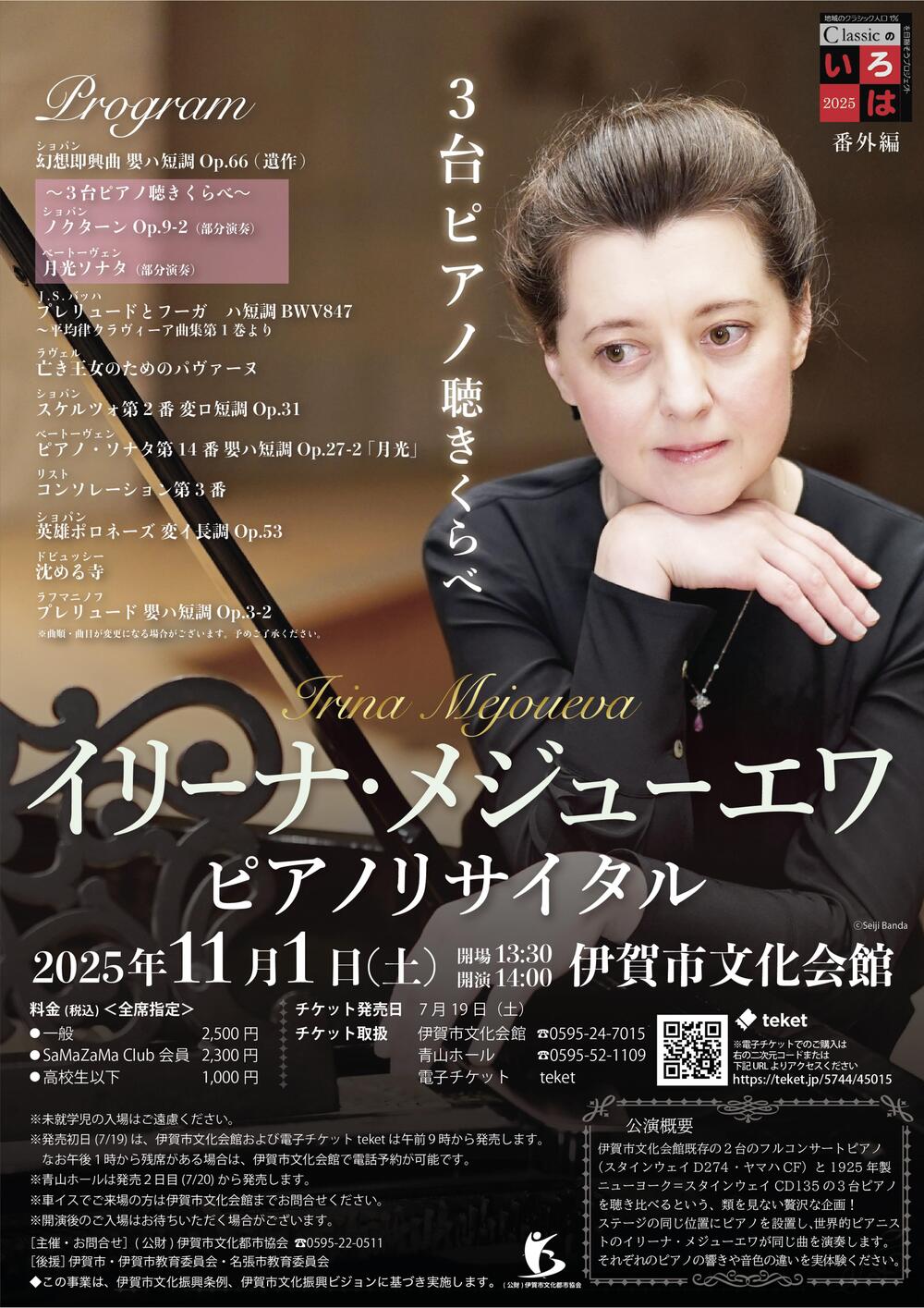 伊賀市文化会館既存の2台のフルコンサートピアノ(スタインウェイD274 ・ヤマハCF)と1925年製ニューヨーク=スタインウェイCD135の3台ピアノを聴き比べる類を見ない贅沢な企画!