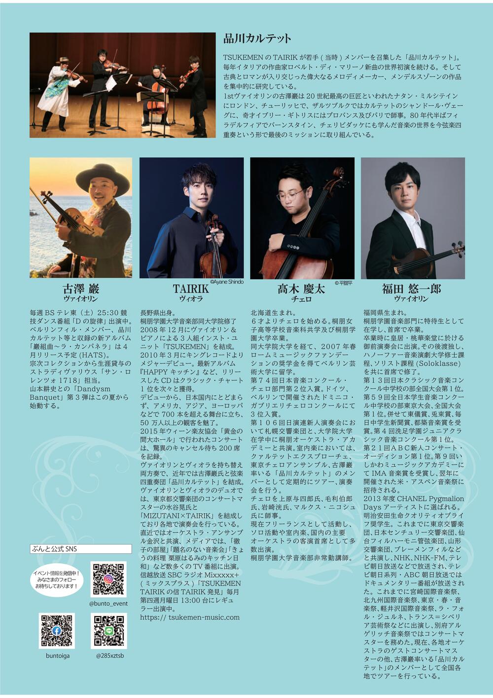 古澤 巖(ヴァイオリン)・TAIRIK(ヴィオラ)・髙木 慶太(チェロ)・福田 悠一郎(ヴァイオリン)