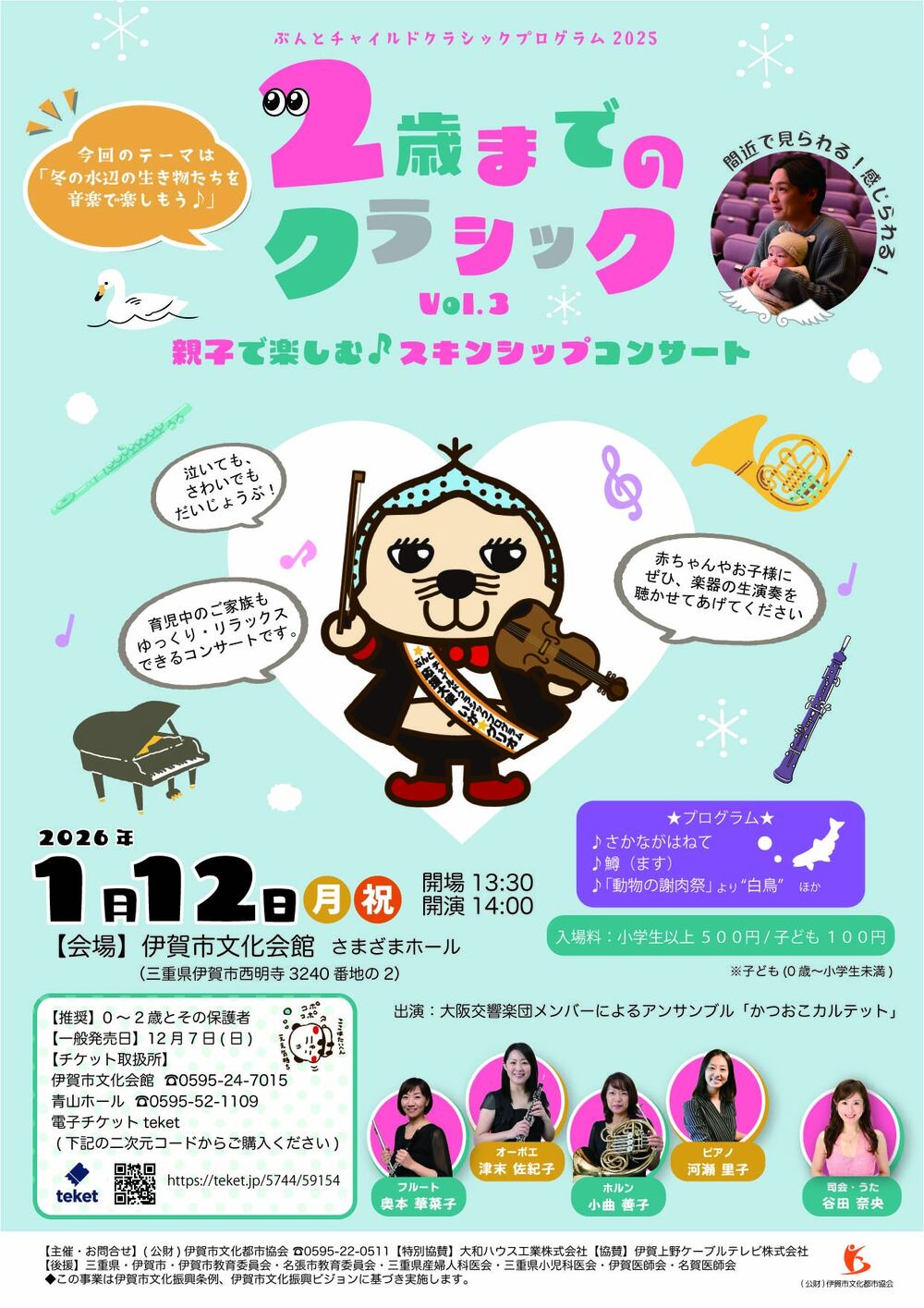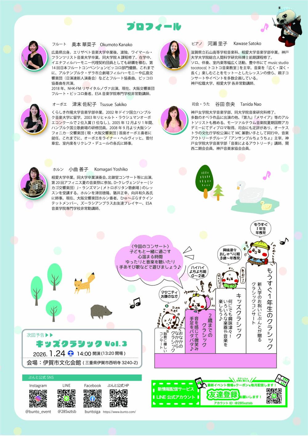 小曲善子(ホルン)、河瀬里子(ピアノ)、谷田 奈央(司会・うた)