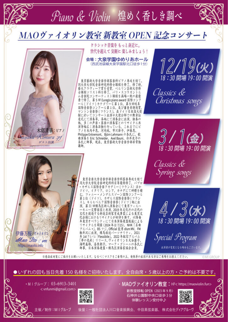 ヴァイオリン教室の移転、新オープン記念コンサートの第3回目(最終回)です。ヴァイオリンの定番の名曲をたっぷりお届けします!