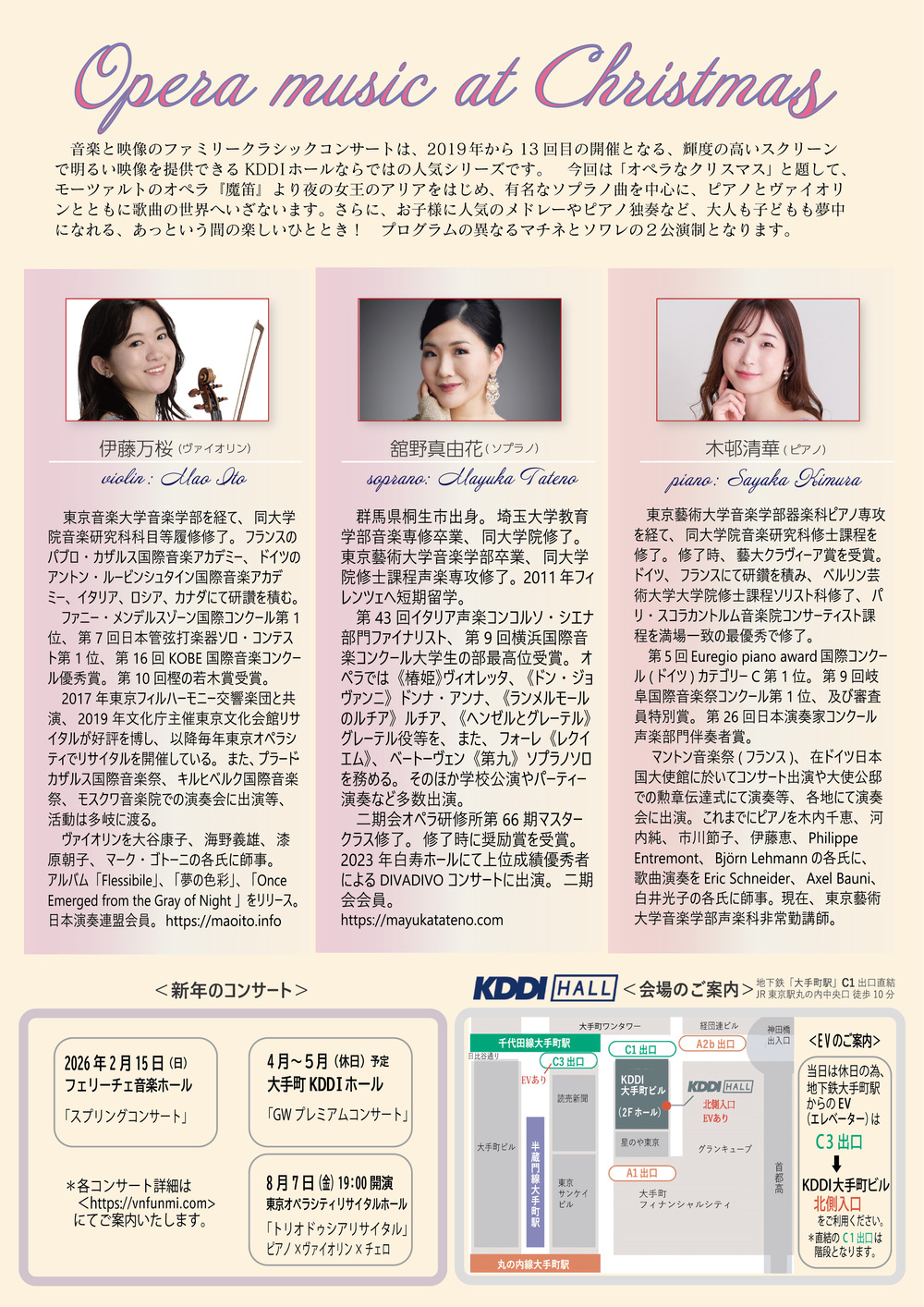 2019年から今回で連続13回目となる、輝度の高いスクリーンで明るい映像を提供できるKDDIホールならではの人気シリーズ。間近に観る迫力ある生演奏と特大スクリーンの映像で、大人も子どもも夢中になれる、あっという間の楽しいひととき、今回は一昨年人気のソプラノが再登場、さらにソワレ(大人のための夜の部)が追加公演に! ピアノ・ヴァイオリン・ソプラノによる、まるでオペラを観るような彩り豊かなクリスマスのハーモニーを一緒に楽しみましょう!! イタリア・ドイツ・ロシアで学んだ3人が思いを込めてお届けします。モーツァルトのオペラ『魔笛』から「夜の女王のアリア」、プッチーニ『ラ・ボエーム』から「私が街を歩くと」、アヴェ・マリア、クリスマスソング・メドレー等、ソプラノ有名曲に加えて、お馴染みのシーズン曲やピアノ独奏、ヴァイオリンのツィゴイネルワイゼンなど盛りだくさんの内容です。