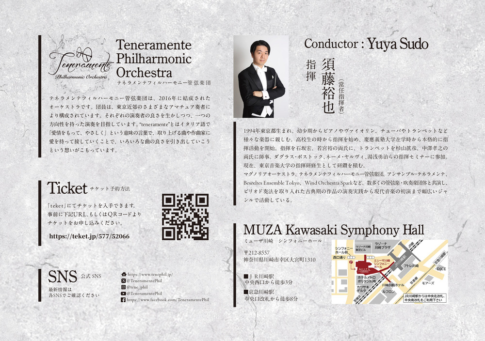 我々テネラメンテフィルハーモニー管弦楽団(通称テネフィル)は、常任指揮者である須藤裕也をはじめ、意欲あふれるメンバーで運営されています。
