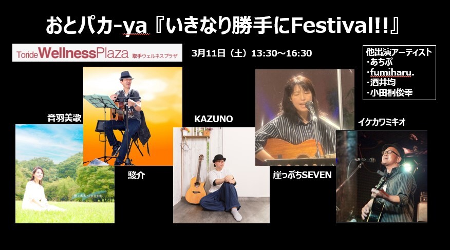 茨城県取手市のウェルネスプラザで『おとパカ-ya』アーティスト達がいきなり勝手に順番に歌い始めます!正式名は『駿介 with おとパカ-ya』というイベント企画になります。