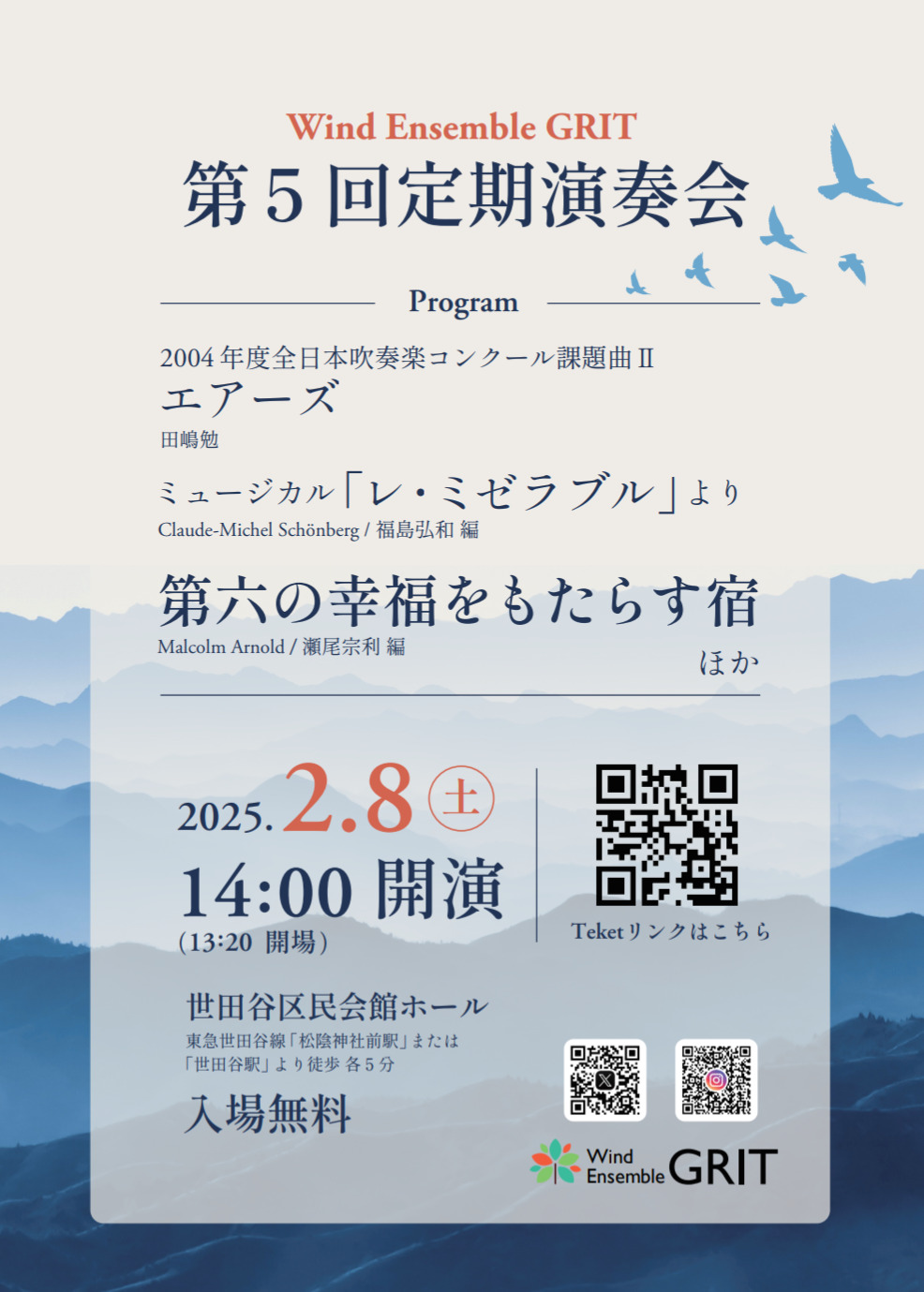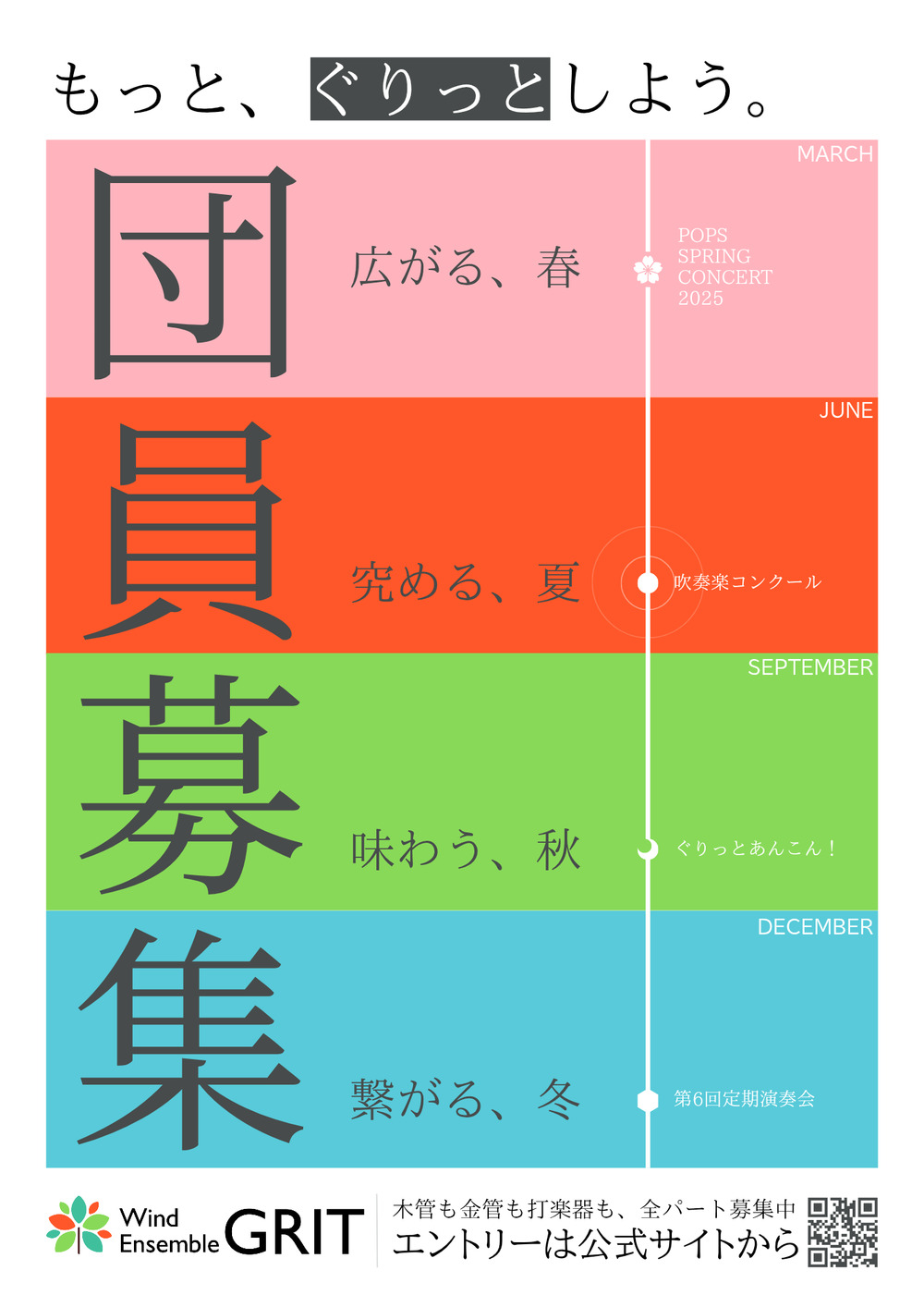 多様なバックグラウンドを持つGRITの団員一同が、お互いの音楽観を持ち寄りながら作り上げてきた演奏を、どうぞお楽しみください。