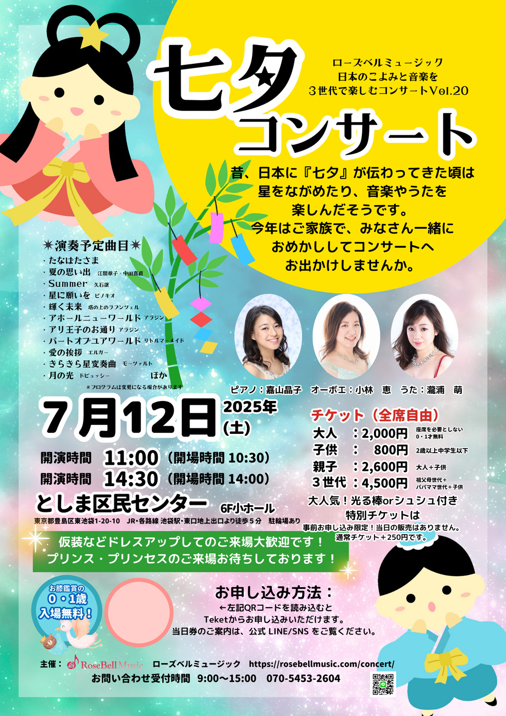 平安時代、日本に「七夕」が伝わってきた頃宮中では、星を見たり音楽や歌を楽しんだとされています。江戸時代には、一般にも広く親しまれていきました。昔から脈々と伝わっている季節の行事と音楽をどちらも経験できる「七夕コンサート2025」ご家族みなさんで、おしゃれをしてお出かけしませんか。