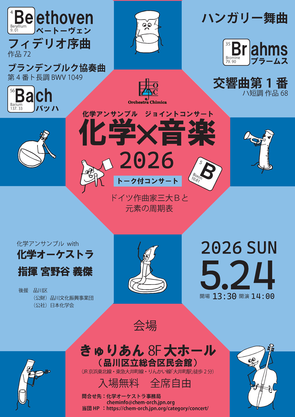 ♪「化学×音楽」ドイツ作曲家三大Bと称されるバッハ(Ba)、ベートーヴェン(Be)、ブラームス(Br)の曲を聴きながら、元素の周期表に登場する「B=ホウ素etc.」のトークも聴ける異色のコンサートです!