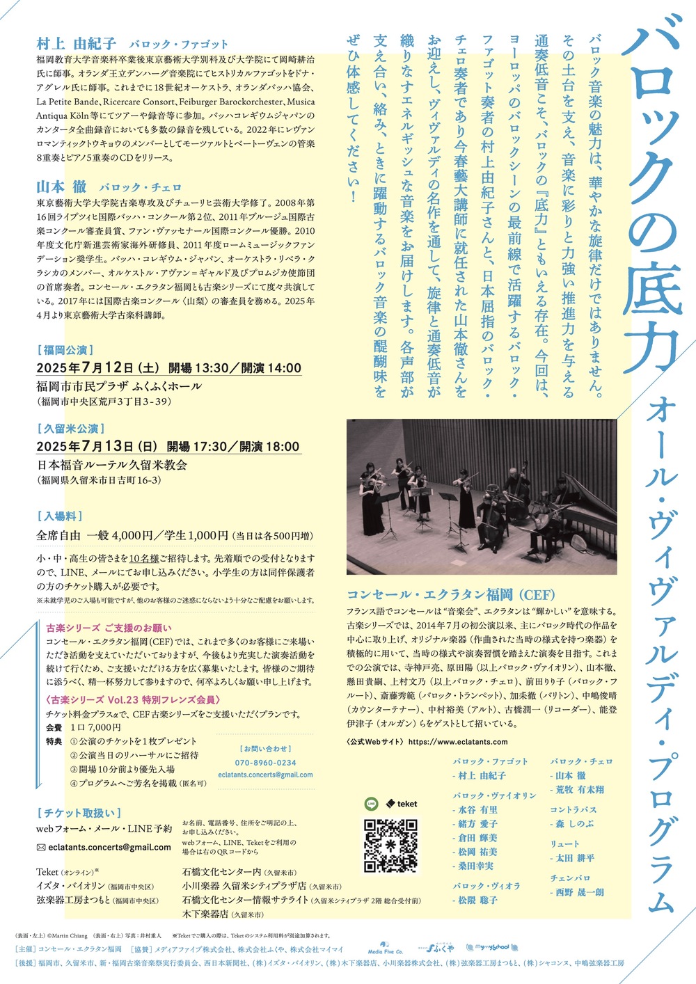 バロック音楽の魅力は、華やかな旋律だけではありません。その土台を支え、音楽に彩りと力強い推進力を与える通奏低音こそ、バロックの“底力”ともいえる存在。今回は、ヨーロッパのバロックシーンの最前線で活躍するバロック・ファゴット奏者の村上由紀子さんと、日本屈指のバロック・チェロ奏者であり今春藝大講師に就任された山本徹さんをお迎えし、ヴィヴァルディの名作を通して、旋律と通奏低音が織りなすエネルギッシュな音楽をお届けします。各声部が支え合い、絡み、ときに躍動するバロック音楽の醍醐味を、ぜひ体感してください!