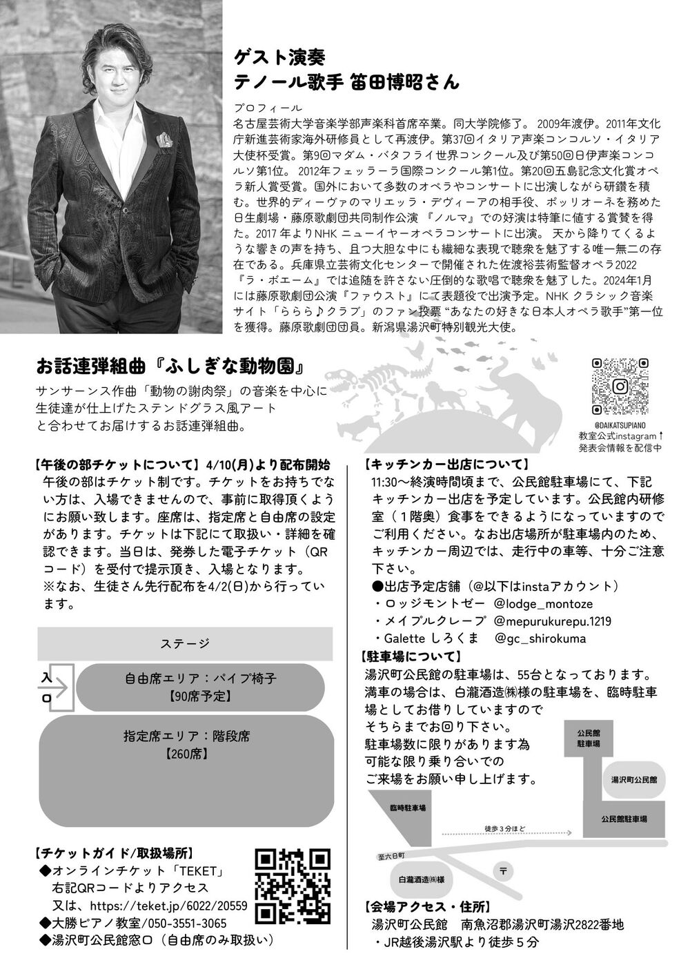 湯沢町公民館の駐車場は、55台となっております。満車の場合は、白瀧酒造㈱様の駐車場を、臨時駐車場としてお借りしていますので、そちらまでお回り下さい。駐車場数に限りがあります為、可能な限り乗り合いでのご来場をお願い申し上げます。