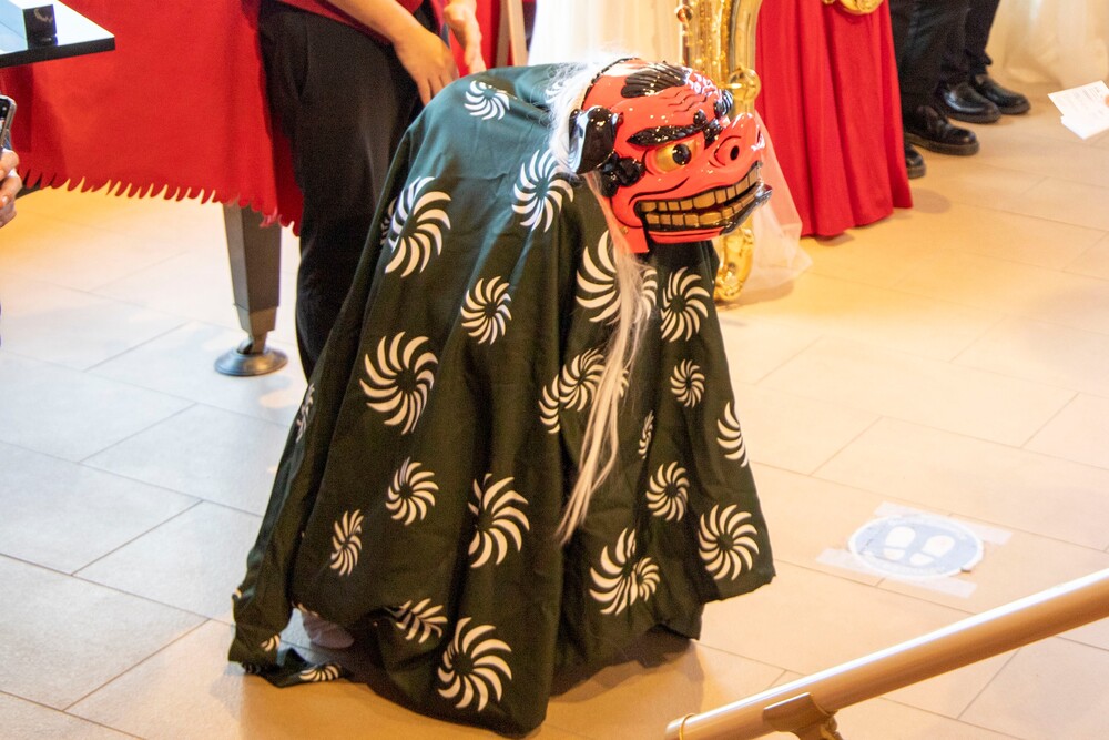 獅子舞に頭を嚙まれると厄除けや開運に!(終演後ロビーで行います)。また、ロビーのカフェブースでは甘酒を販売いたします。お正月を波乗亭で一気に満喫!