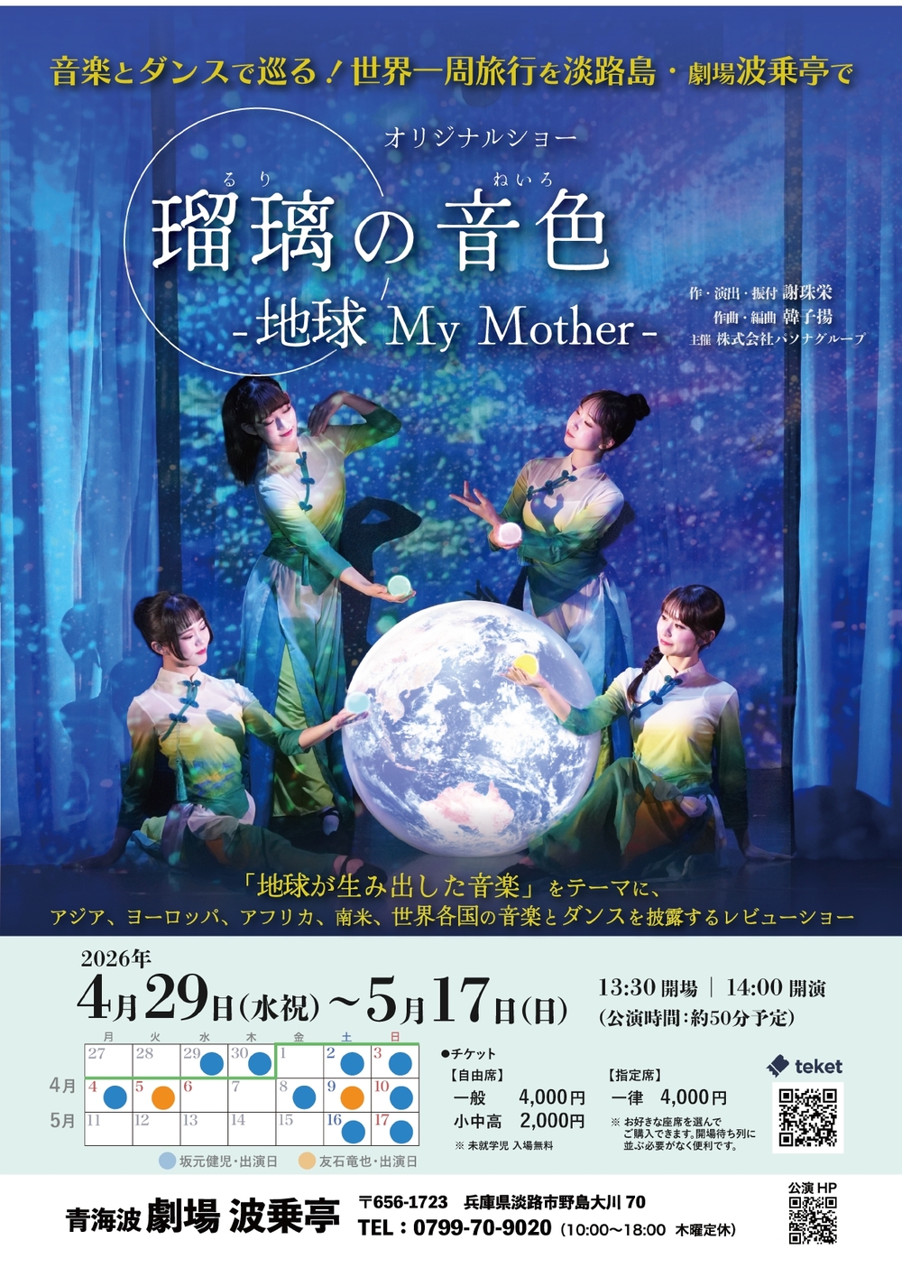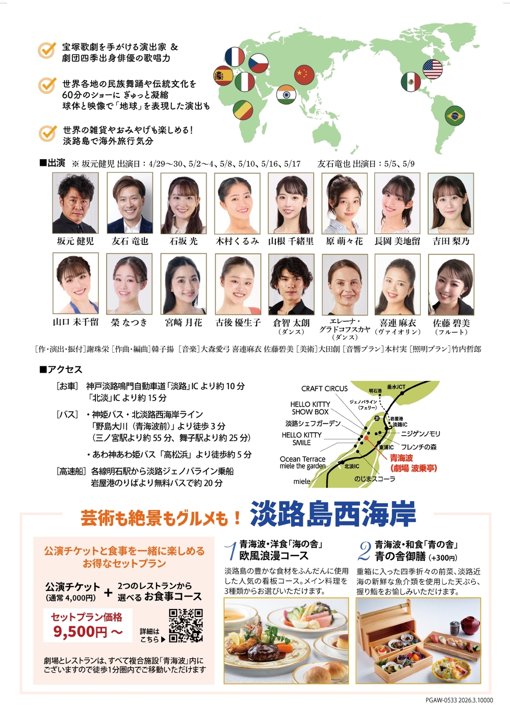 「地球が生み出した音楽」をテーマに、アジア、ヨーロッパ、アフリカ、南米と、世界各国の音楽と舞踊で表現する60分間のレビューショー。作・演出・振付は謝珠栄、メインボーカルに坂元健児、そして友石竜也を迎え、世界の文化を辿っていきます。