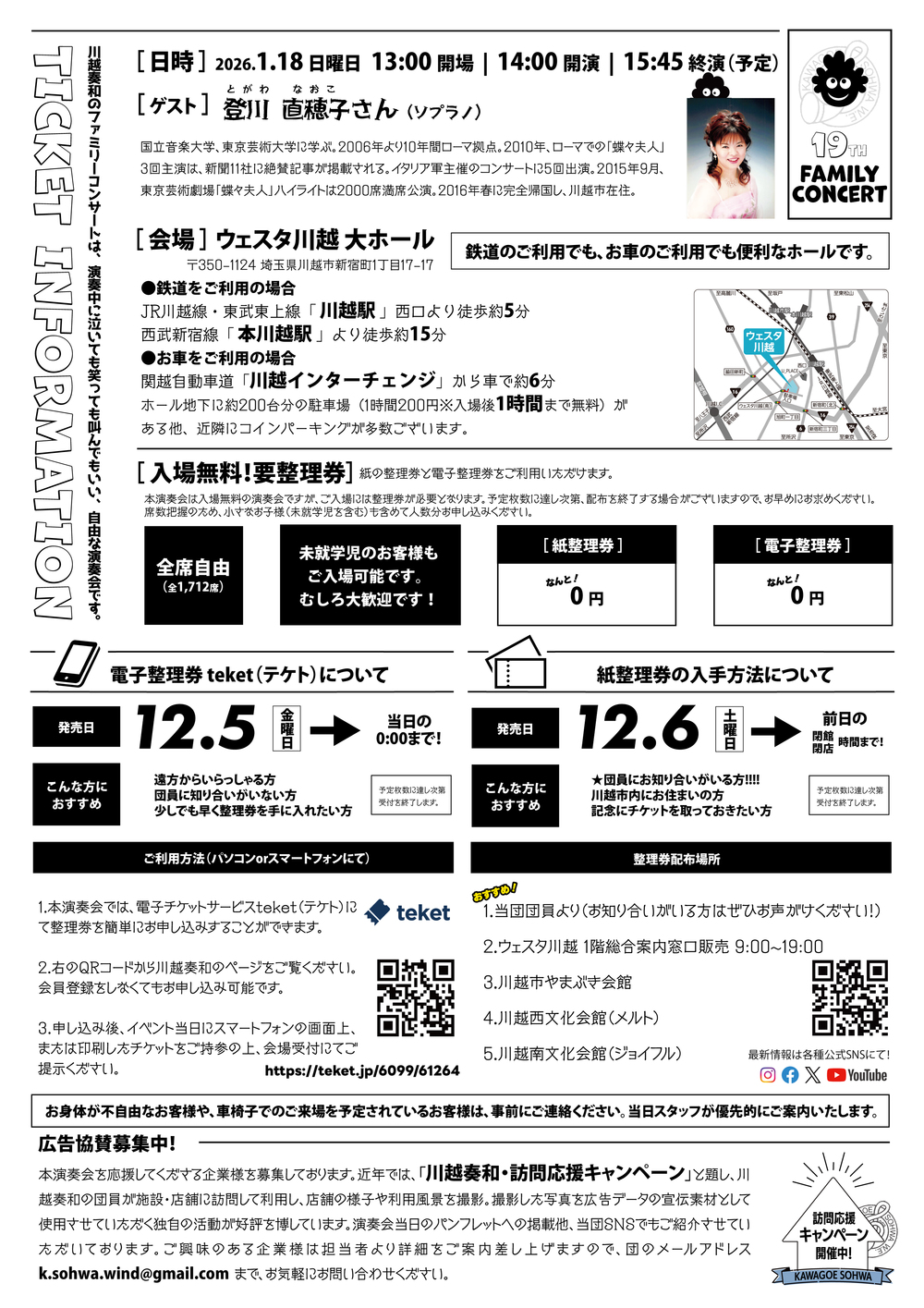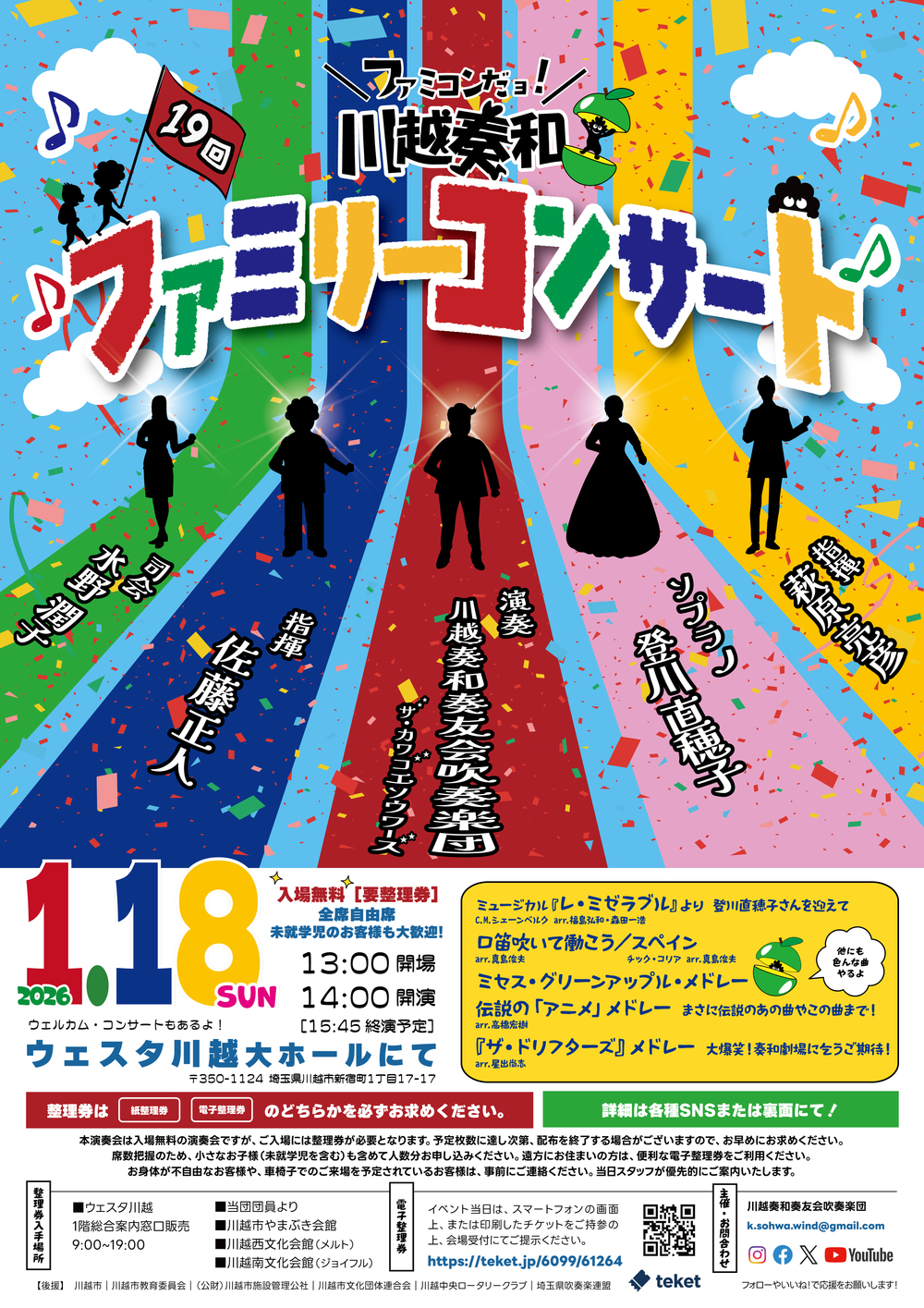 川越奏和のファミリーコンサートは、なんと入場無料・未就学児入場可能な演奏会。演奏中に泣いても笑っても叫んでもいい自由な演奏会で、今回第19回目を迎えます。