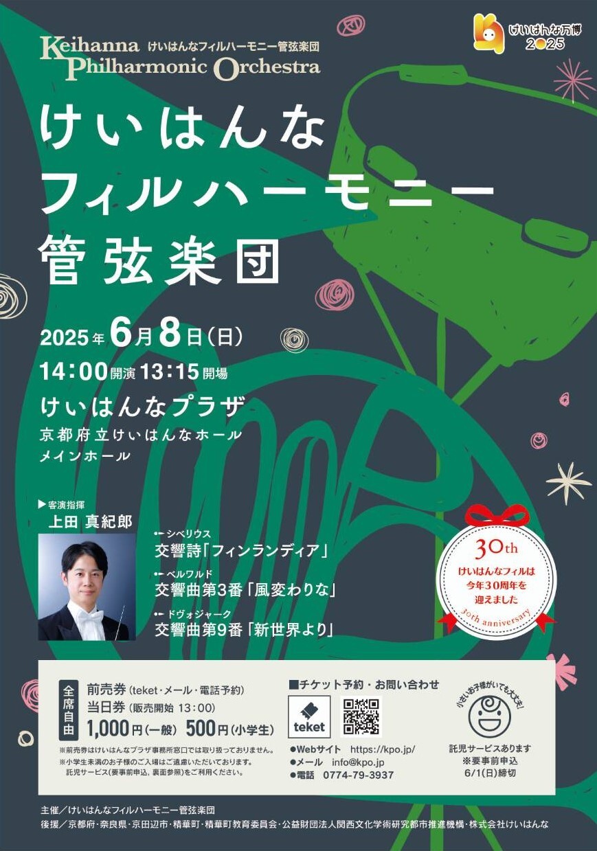 今回は上田真紀郎氏を客演指揮者にお招きし、シベリウスの交響詩「フィンランディア」、ベルワルドの交響曲第3番「風変わりな」、ドヴォジャークの交響曲第9番「新世界より」を演奏します。おなじみの名曲2曲の間にベルワルドを挟むのが、けいはんなフィルらしいプログラム。あまり知られていないベルワルドですが、とても素直な楽しい曲です。ぜひ足をお運びください。
