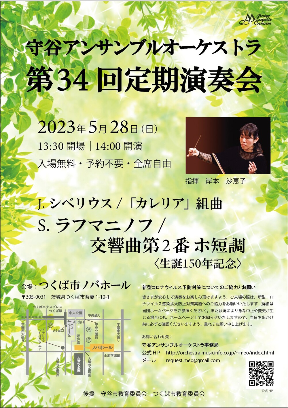 守谷アンサンブルオーケストラは、茨城県守谷市で活動しているアマチュア・オーケストラです。5/28に行われる第34回定期演奏会では、岸本沙恵子先生をお迎えし、今年生誕150年を迎えるラフマニノフの大曲に挑みます。団員一同、皆様のお越しを心よりお待ちしております。(本演奏会は入場無料・全自由席です。)