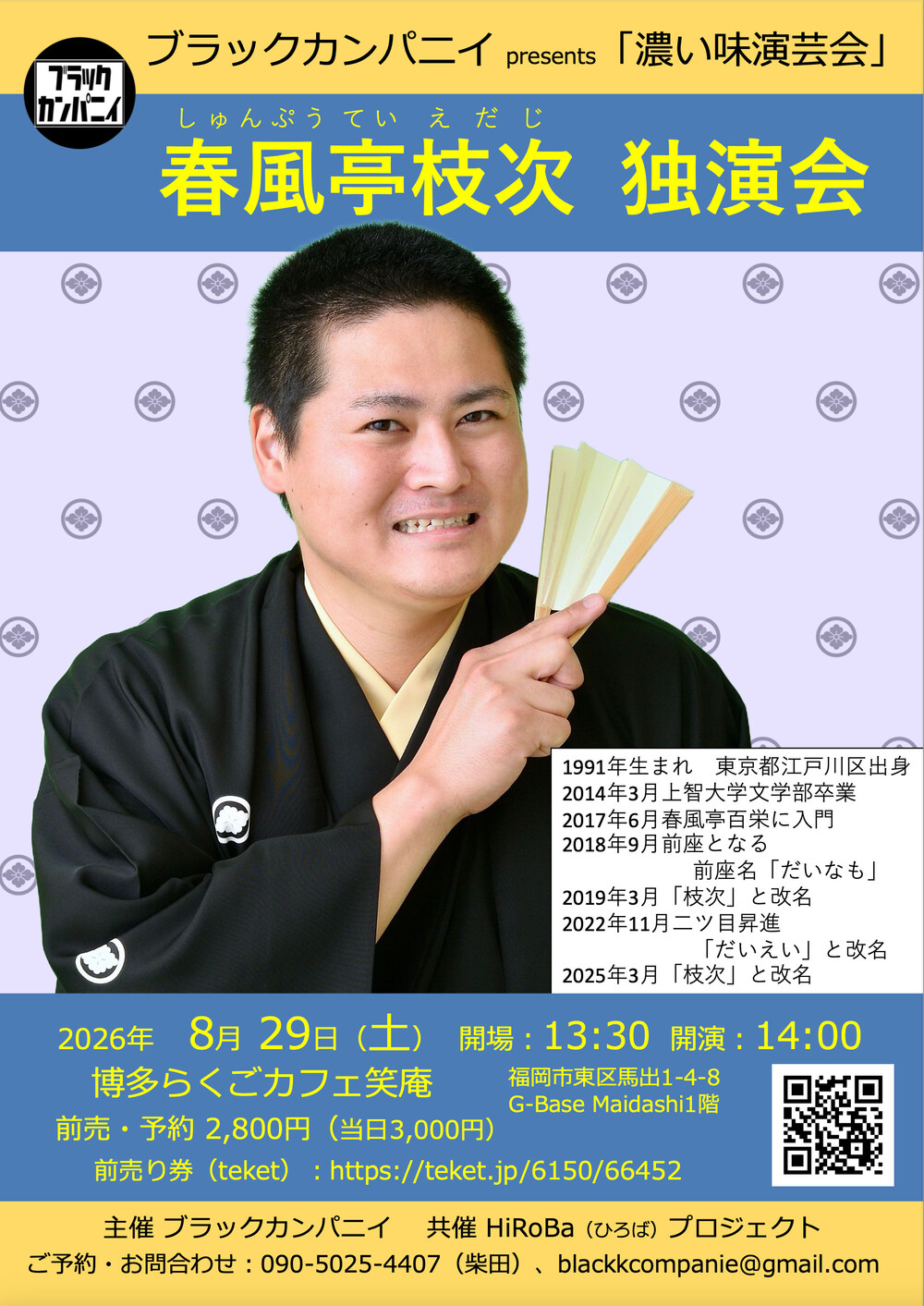 春風亭百栄門下。古典落語をメインにしつつ、快楽亭ブラックの毒落語も受け継ぐ気鋭の二つ目、福岡初登場!