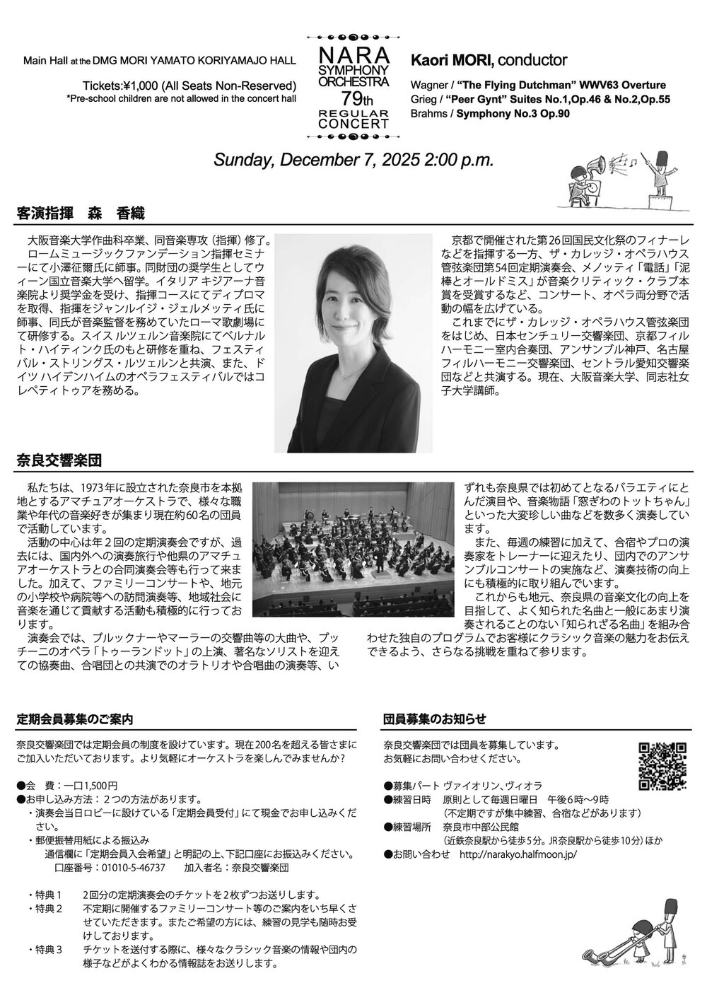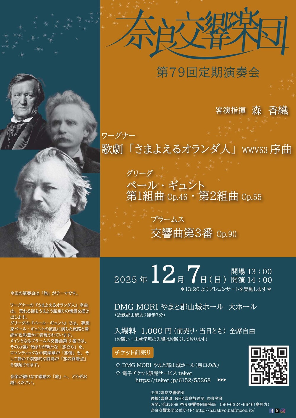今回の演奏会は「旅」がテーマです。ワーグナーの『さまよえるオランダ人』序曲は、荒れる海をさまよう船乗りの情景を描き出します。グリーグの『ペール・ギュント』では、夢想家ペール・ギュントの波乱に満ちた旅路と帰郷が色彩豊かに表現されています。メインとなるブラームス交響曲第3番では、その力強い始まりが新たな「旅立ち」を、ロマンティックな中間楽章が「旅情」を、そして静かで瞑想的な終焉が「旅の終着点」を想起させます。音楽が織りなす感動の「旅」へ、どうぞお越しください。