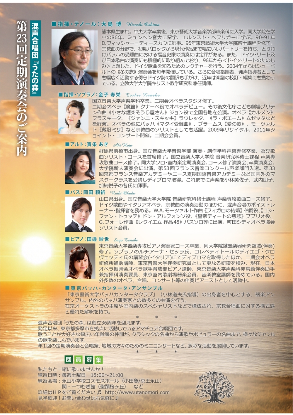 独唱:ソプラノ 金子 寿栄、アルト 寶条 あき、テナー 大島 博、バス 岡田 頼祈