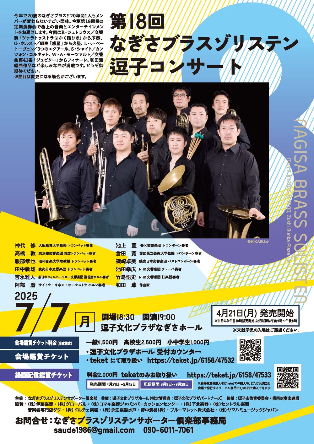 なぎさブラスゾリステンは本拠地を逗子とする国内最高峰のオーケストラに所属している金管、打楽器奏者によるアンサンブルです。前回に引き続き、全てオリジナルアレンジによる素晴らしい、また楽しいコンサートをご自宅へお届けすることとなりました。感動と爆笑のステージをどうぞお楽しみに!