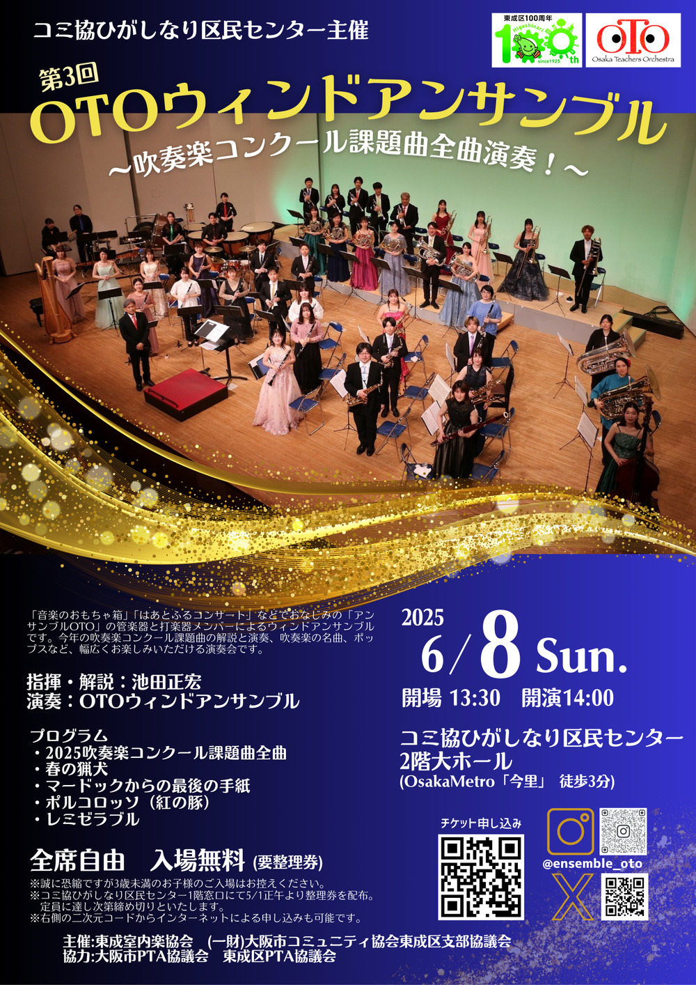 「音楽のおもちゃ箱」「はあとふるコンサート」などでおなじみの「アンサンブルOTO」の管楽器と打楽器メンバーによるウィンドアンサンブルです。今年の吹奏楽コンクール課題曲の解説と演奏、吹奏楽の名曲、ポップスなど、幅広くお楽しみいただける演奏会です。