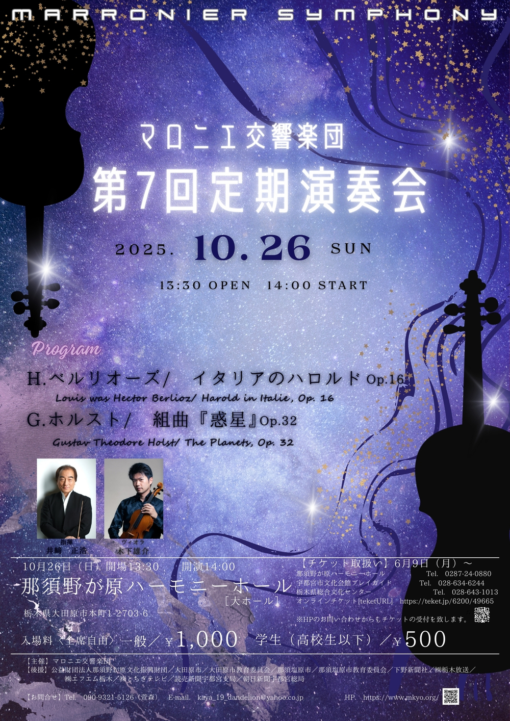 今回もチャレンジングなプログラムに挑みます。惑星は全曲、ヴィオラ独奏のイタリアのハロルド、どちらもレアな演奏です。この機会をぜひ逃さぬよう、旅行がてら那須野が原ハーモニーホールまでぜひお越しください。よろしくお願い致します!